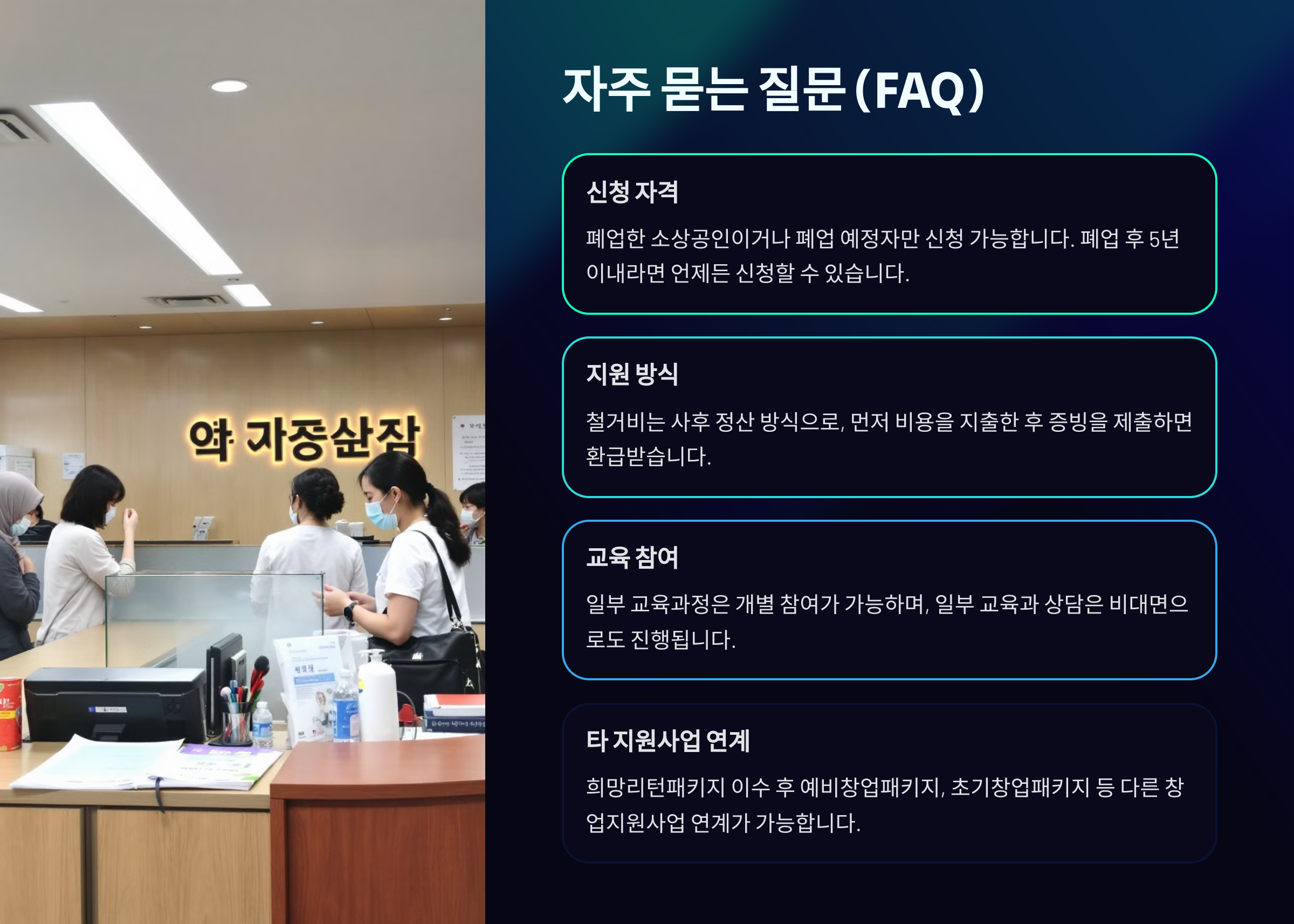 | 지원 항목 | 폐업지원 + 재창업 교육 + 컨설팅 |