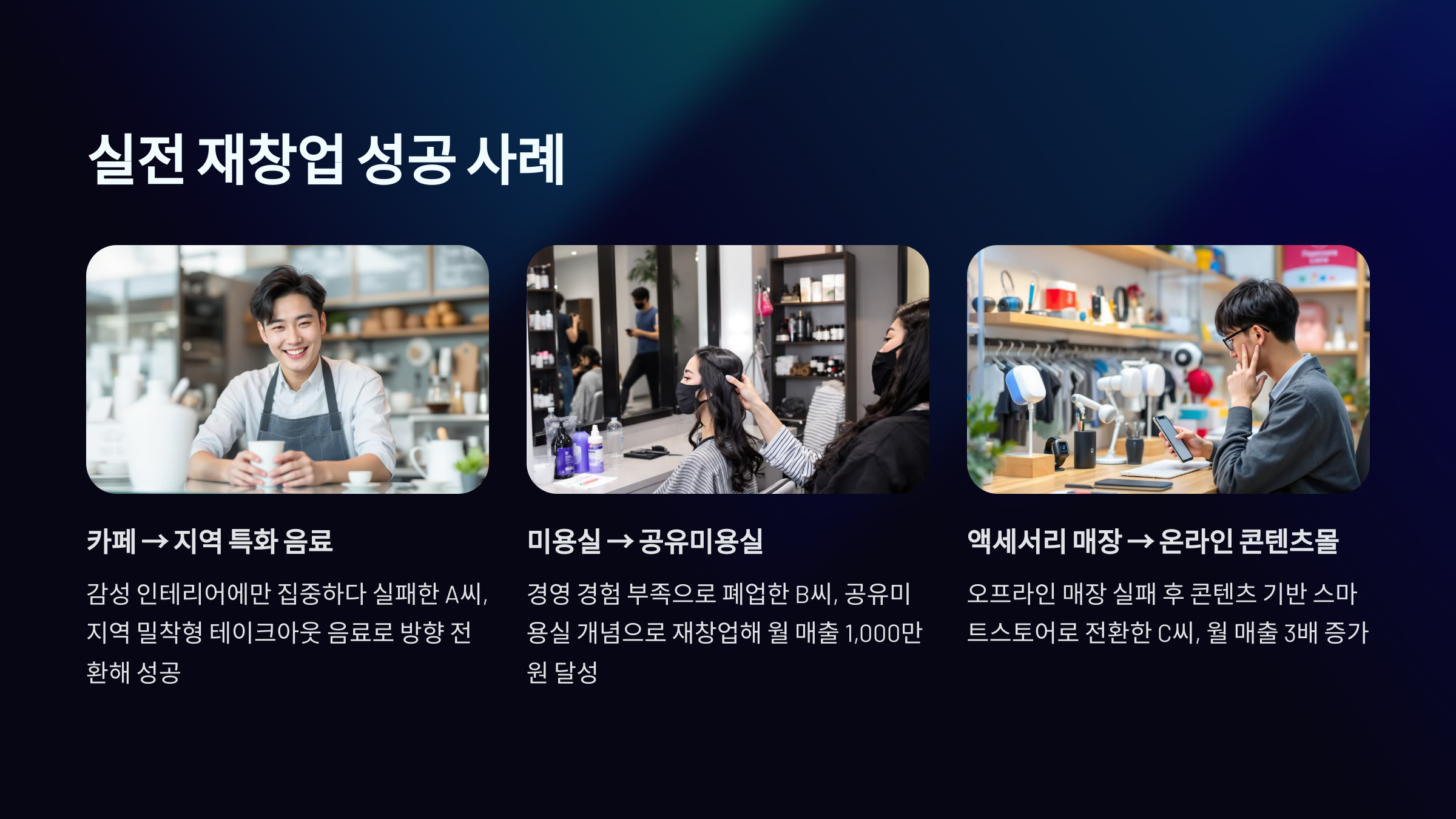 | 이름(가명) | 기존 업종 | 재창업 아이템 | 성과 |