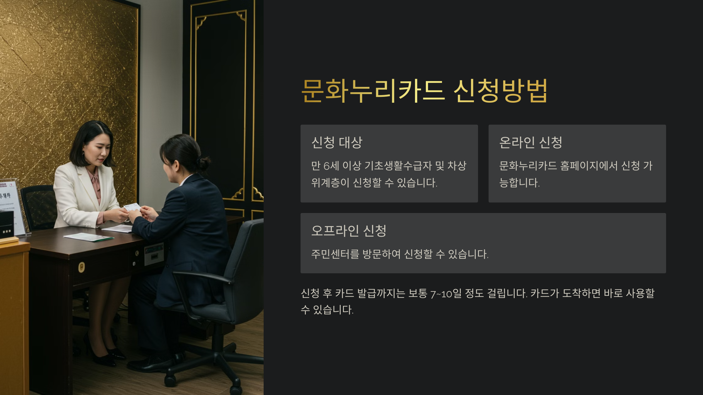 | 온라인 신청 | 문화누리카드 홈페이지에서 신청 가능 |