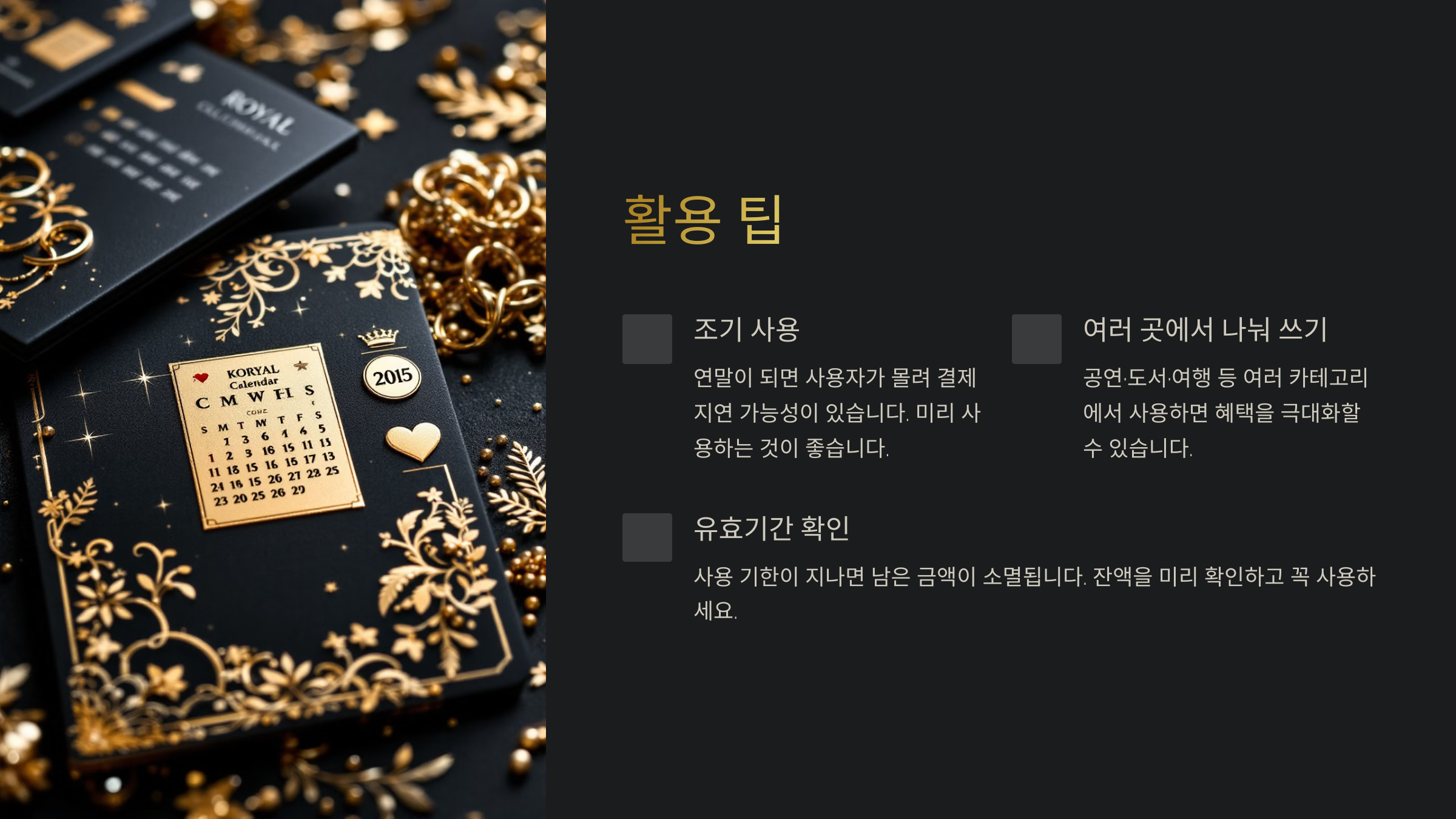 | 🎟️ 조기 사용 | 연말이 되면 사용자가 몰려 결제 지연 가능성이 있어요. 미리 사용하는 것이 좋아요! |