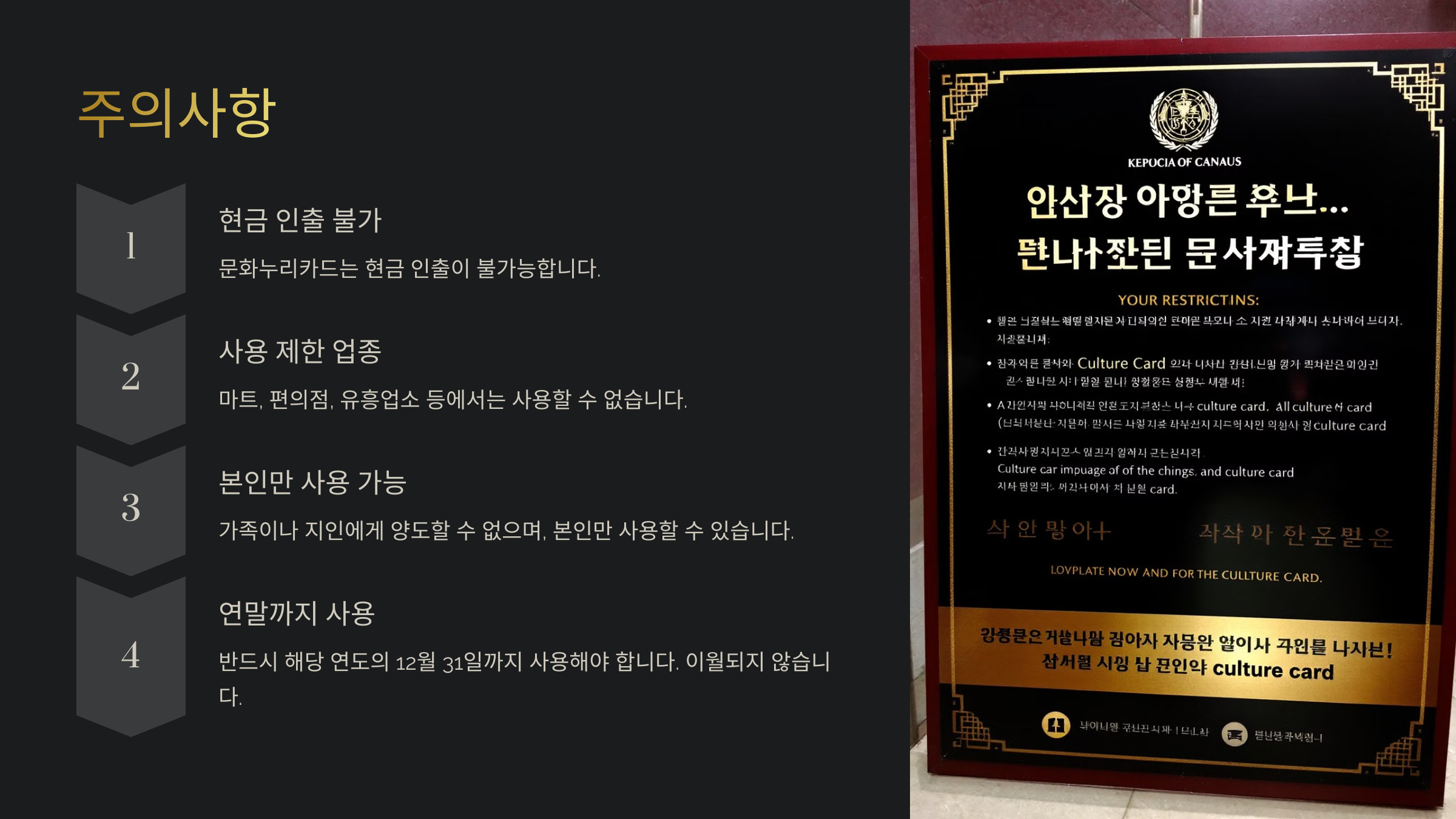 - 사용할 수 없는 업종(마트, 편의점, 유흥업소 등)이 있으니 미리 확인하세요.