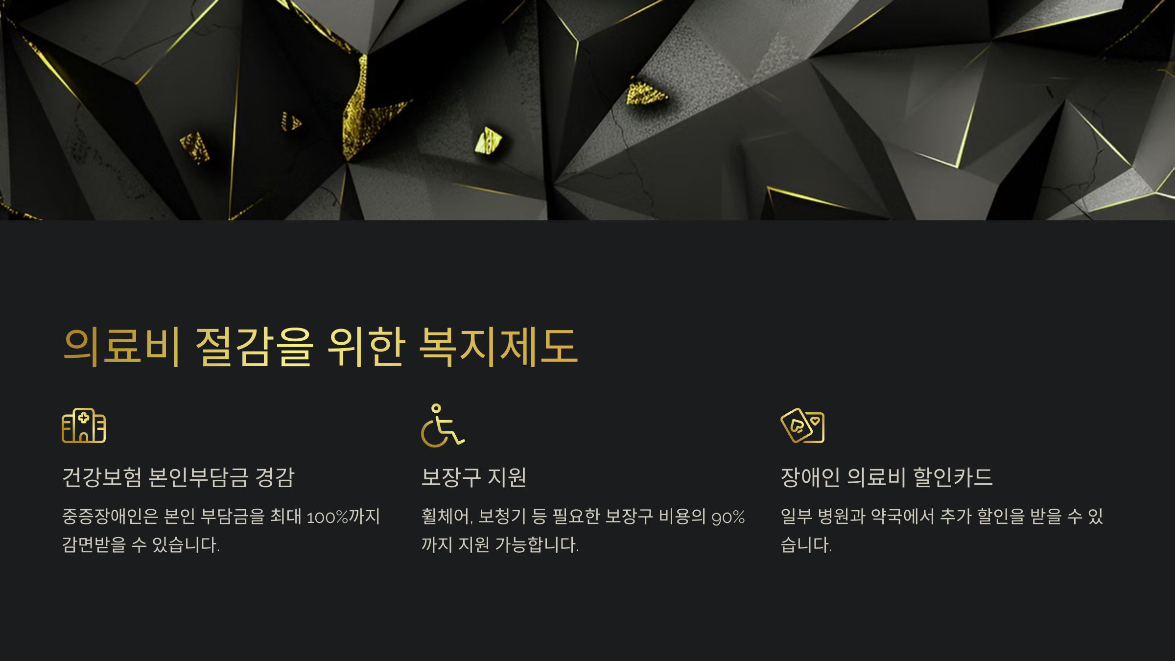 | 건강보험 본인부담금 경감 | 본인 부담금 최대 100% 지원 | 중증장애인 |