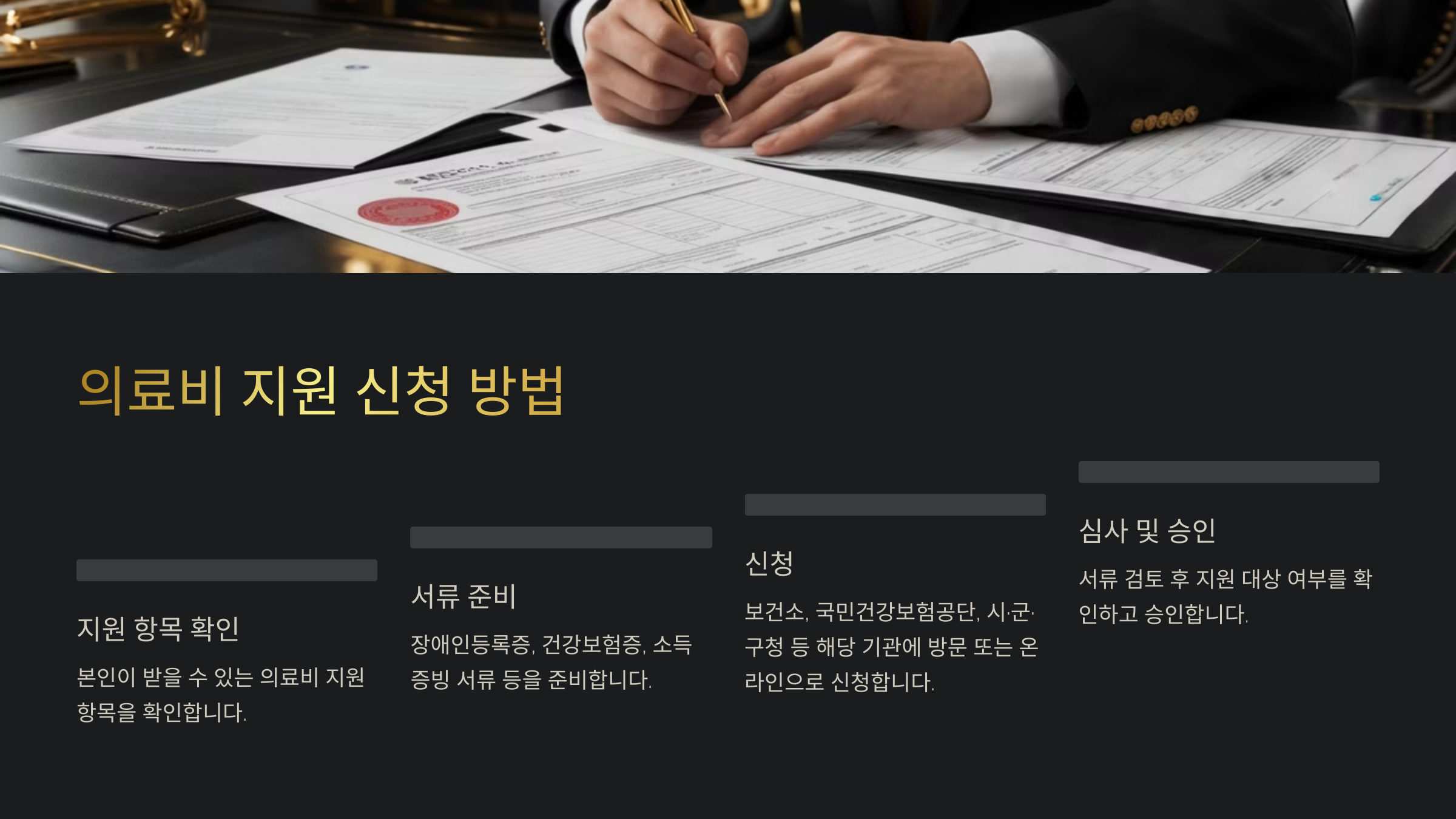 | 1. 지원 항목 확인 | 건강보험 감면, 의료급여, 보장구 지원 등 본인이 받을 수 있는 지원 항목 확인 |