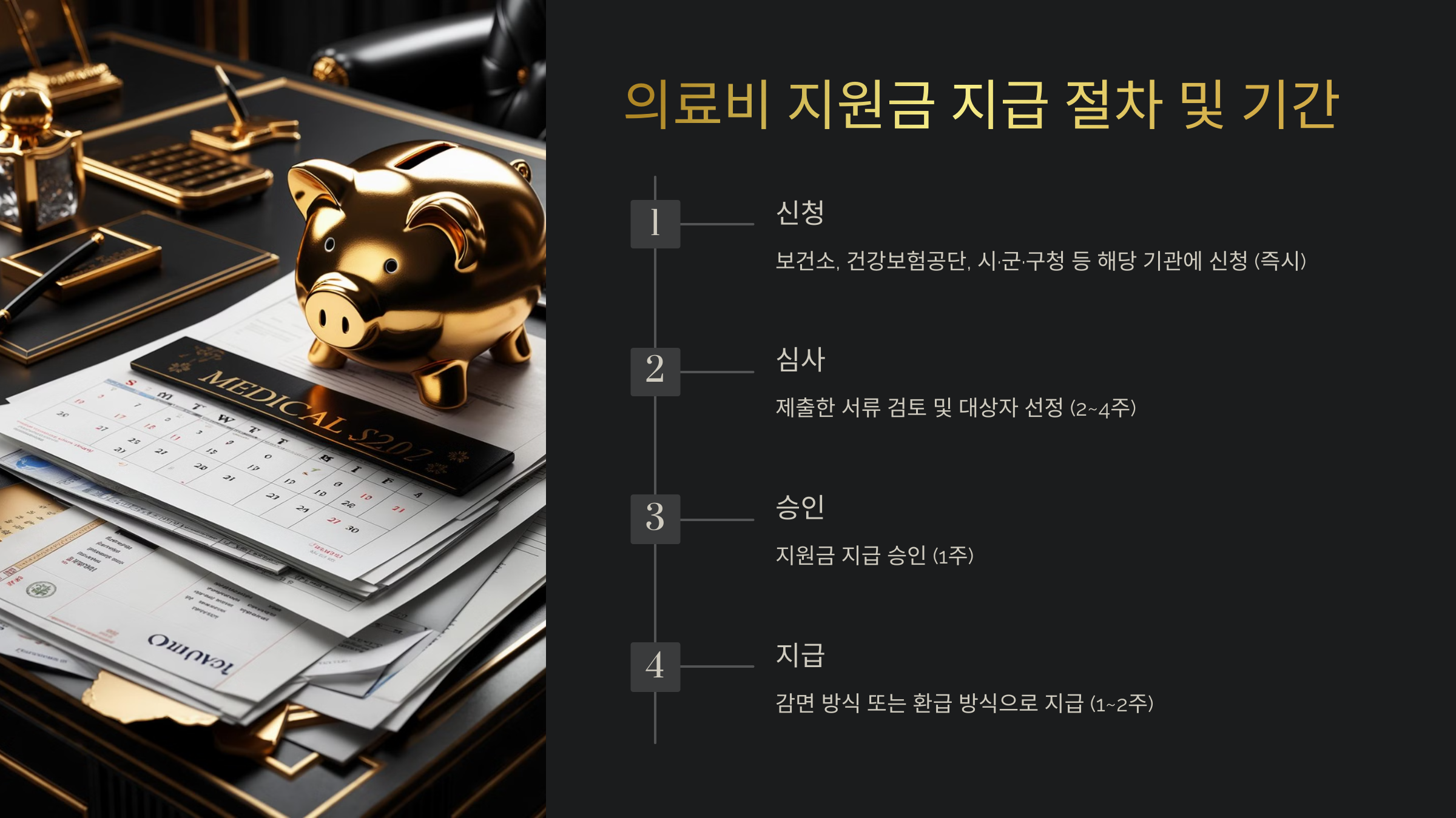 의료비 지원금 지급 과정은 일반적으로 신청 → 심사 → 승인 → 지급 순으로 진행돼요. 신청 후 심사 기간이 필요하므로 즉시 지급되는 것은 아니에요.