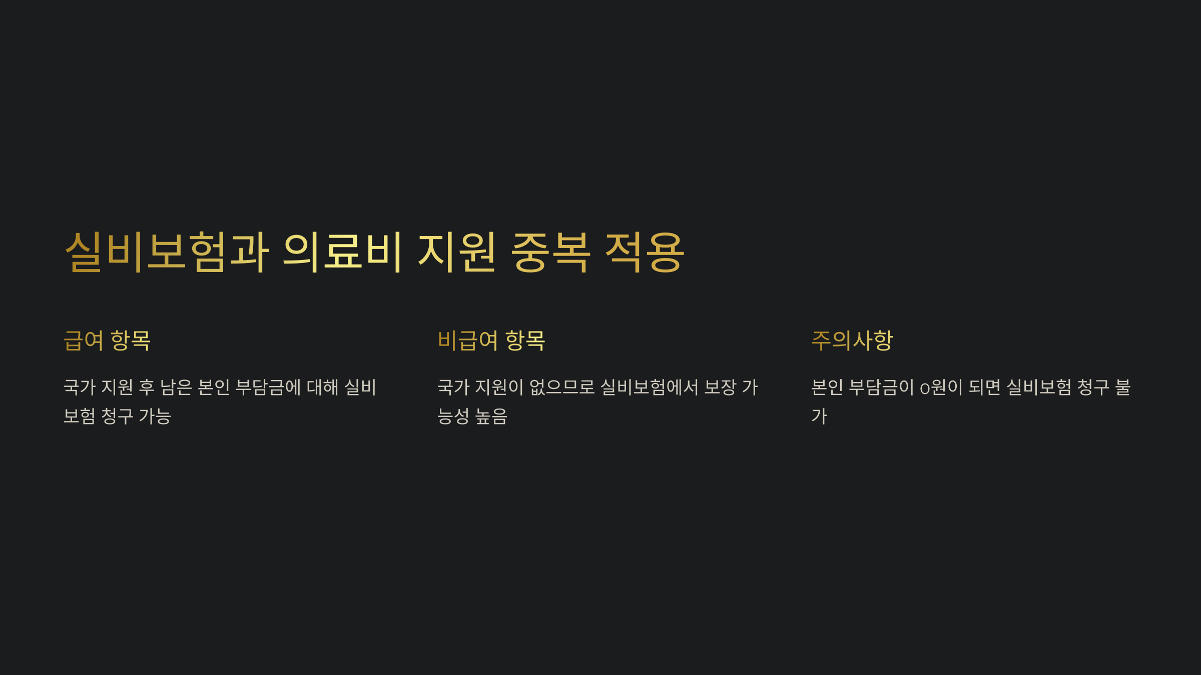 | 건강보험 적용 후 본인 부담금 | 일부 지원 | 남은 금액에 대해 보장 |