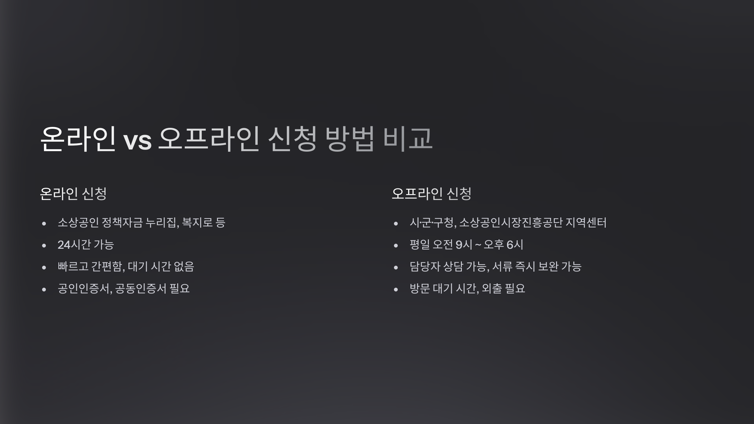 소상공인 지원금은 온라인과 오프라인 모두 신청이 가능해요. 각 방법마다 장단점이 있으니 내 상황에 맞게 선택하는 게 좋아요!