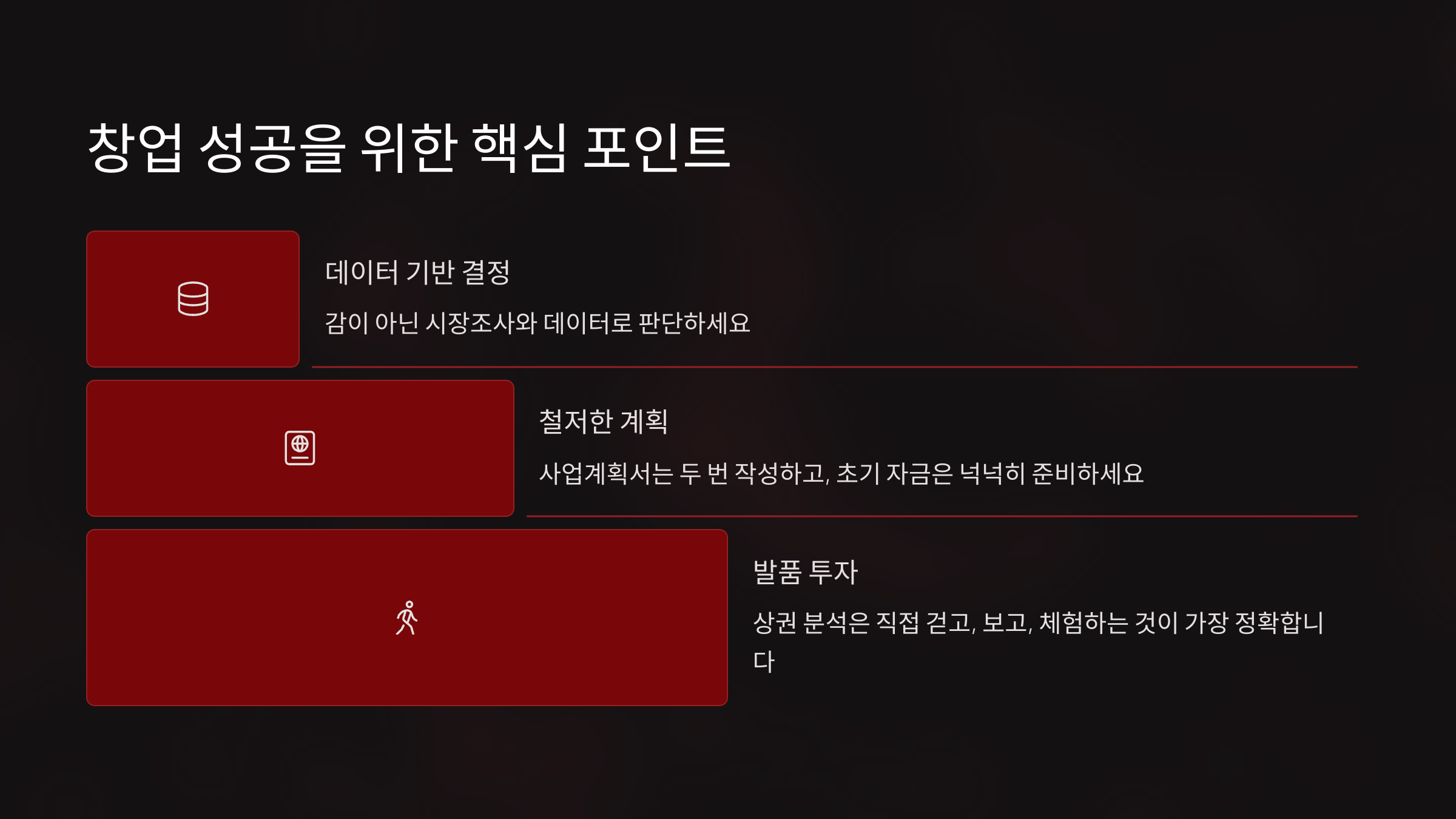 “어디서 하느냐”는 창업 성공의 절반이에요. 좋은 아이템도 입지가 잘못되면 망하고, 평범한 아이템도 위치가 좋으면 성공해요.
