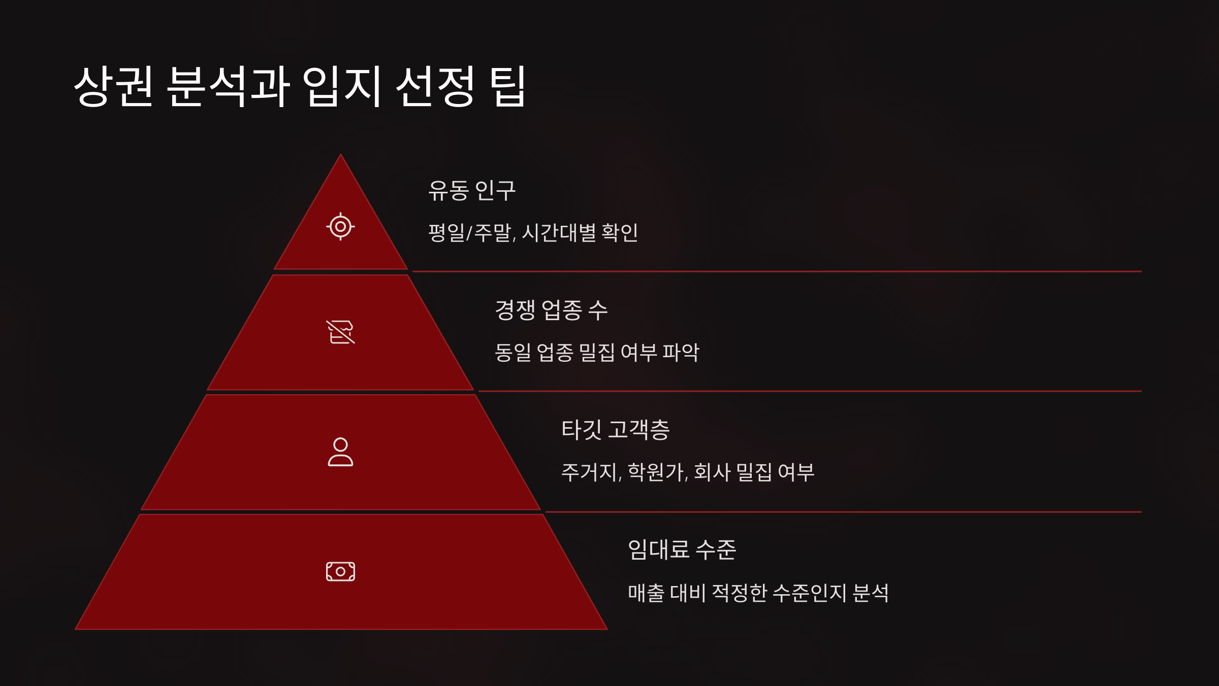 - 타깃 고객층의 생활 반경 – 주거지, 학원가, 회사 밀집 여부