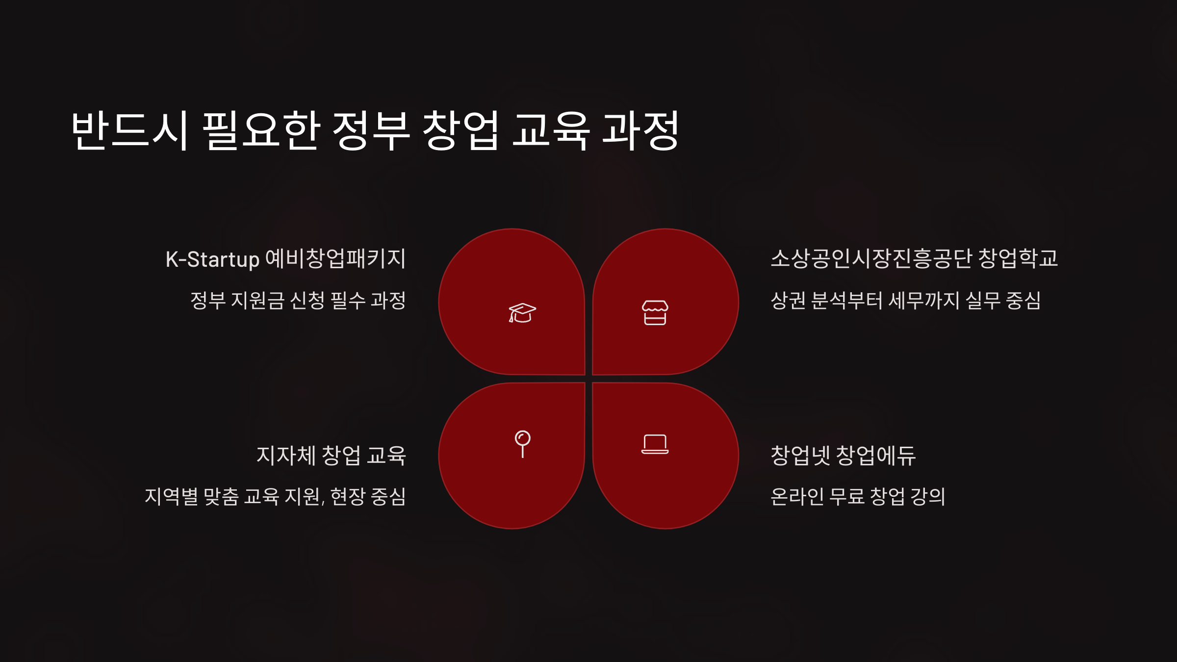 🎯 교육을 제대로 들어두면, 내 사업 아이템을 다듬는 데 큰 도움이 돼요. 심지어 교육 이수자 전용 프로그램이 따로 있는 경우도 많아요!