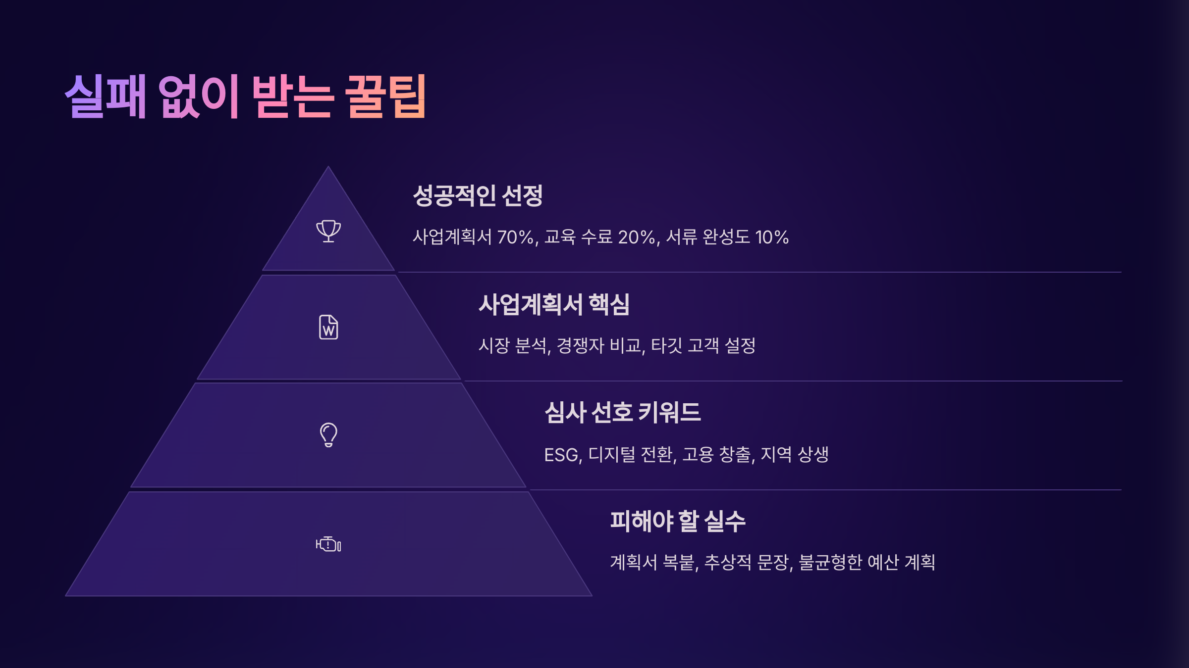 🔥 사업계획서 70%, 교육 수료 20%, 서류 완성도 10% 이 조합이면 대부분 선정돼요!