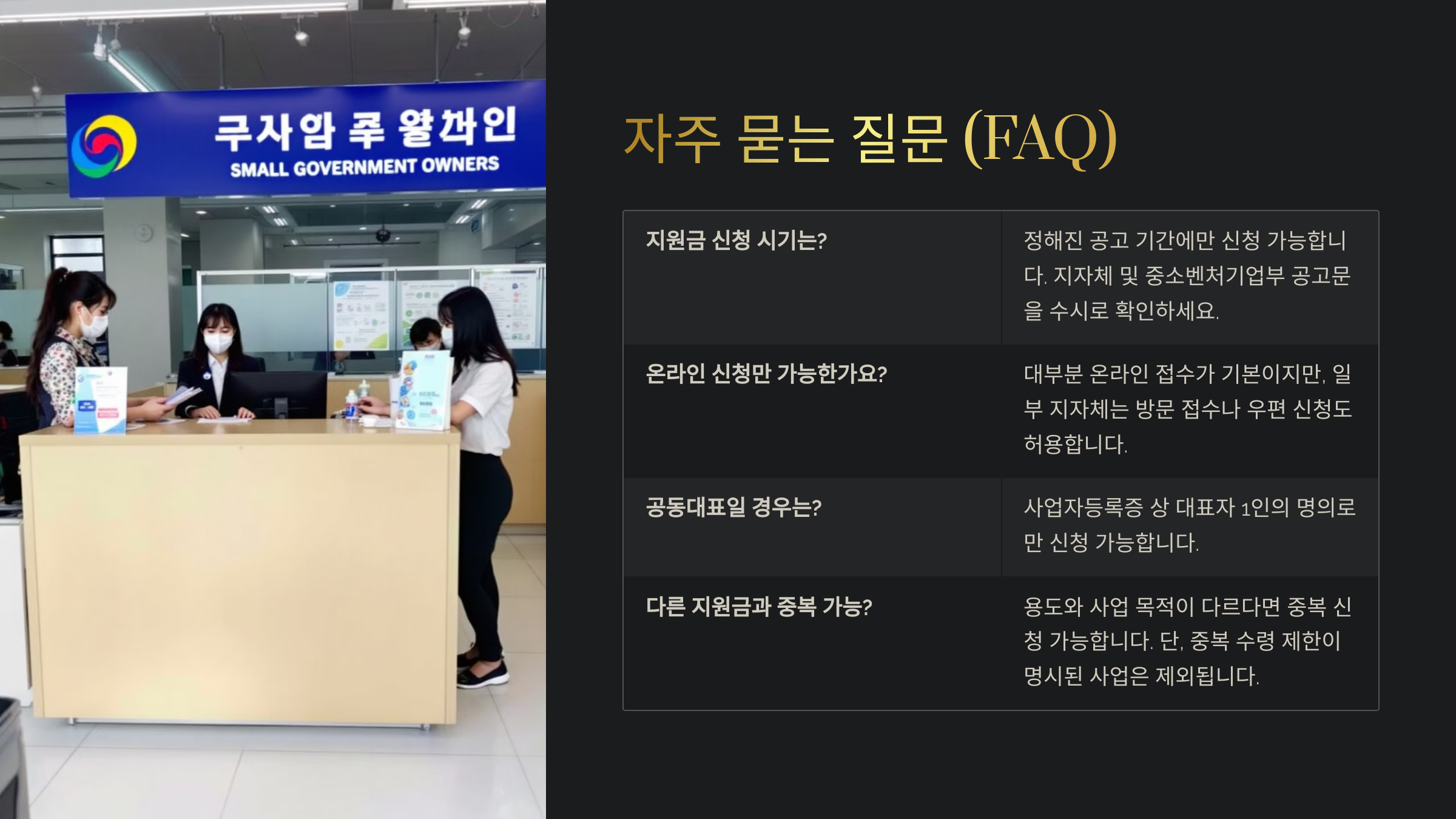 A5. 현재 사업자등록이 유지되고 실제 영업 중이라면 신청은 가능해요. 하지만 지급 이후 폐업 시 환수 대상이 될 수 있으니 신중히 결정하세요.