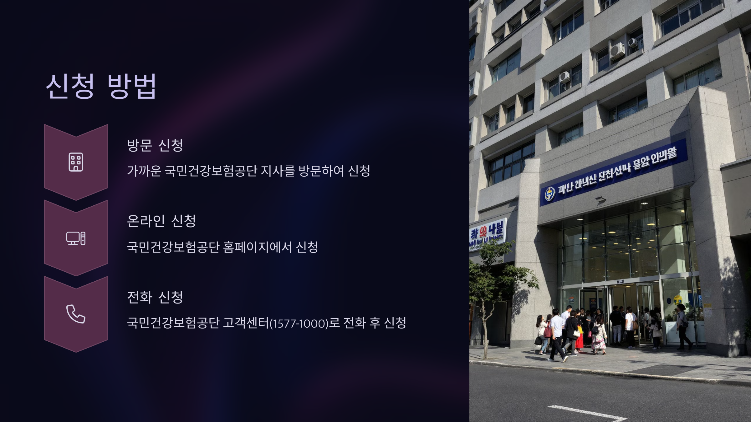서류가 준비되면 국민건강보험공단을 방문하거나 온라인으로 신청할 수 있어요.