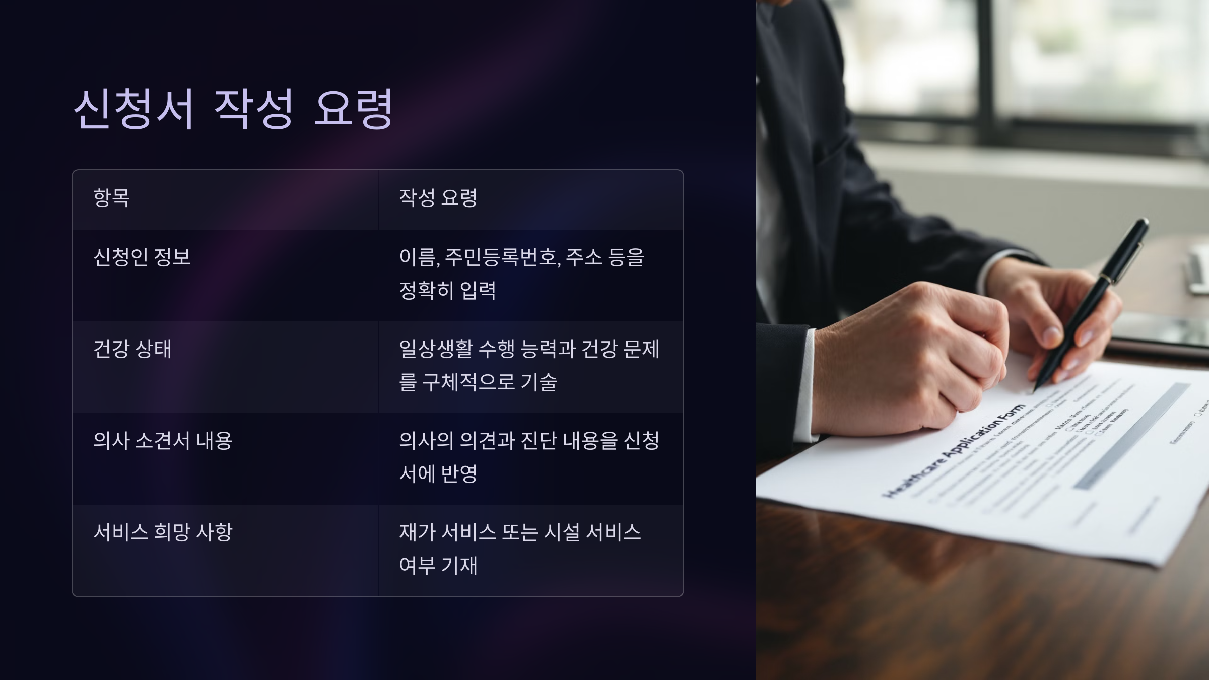 장기요양보험 신청서를 작성할 때는 정확한 정보를 기재해야 해요. 신청서가 부실하면 심사 과정에서 불이익을 받을 수 있어요.