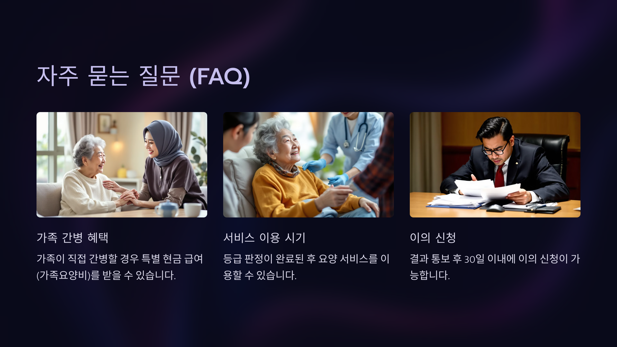 A7. 네, 가족이 직접 간병할 경우 특별 현금 급여(가족요양비)를 받을 수 있어요. 하지만 배우자나 자녀만 신청 가능해요.