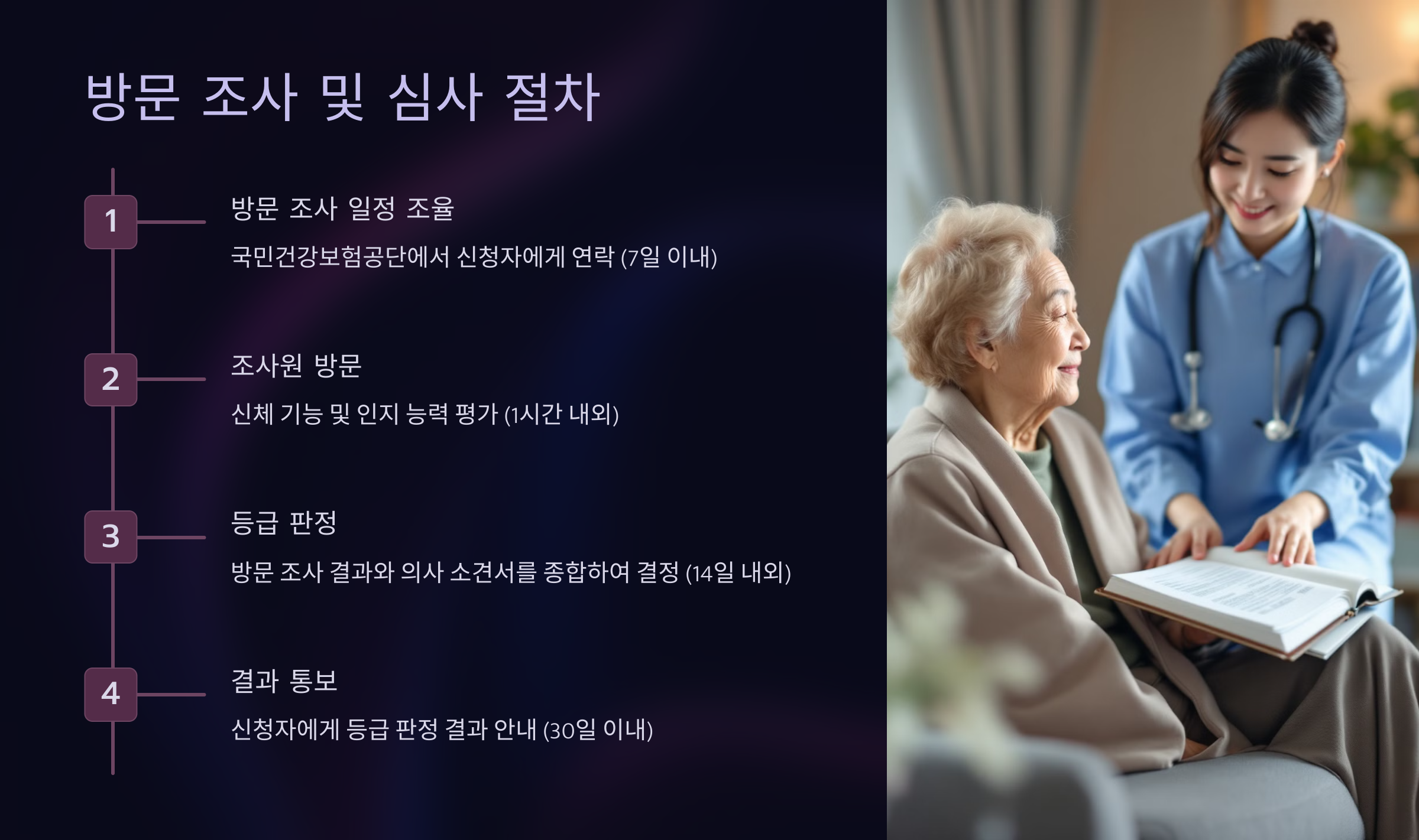| 3. 등급 판정 | 방문 조사 결과와 의사 소견서를 종합하여 결정 | 14일 내외 |