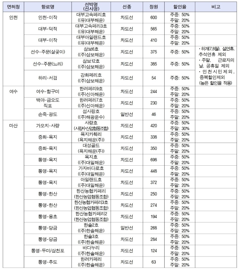 📌지역 및 노선: 인천, 제주, 통영, 여수 등 39개의 항로에서 48척의 여객선을 운행합니다.