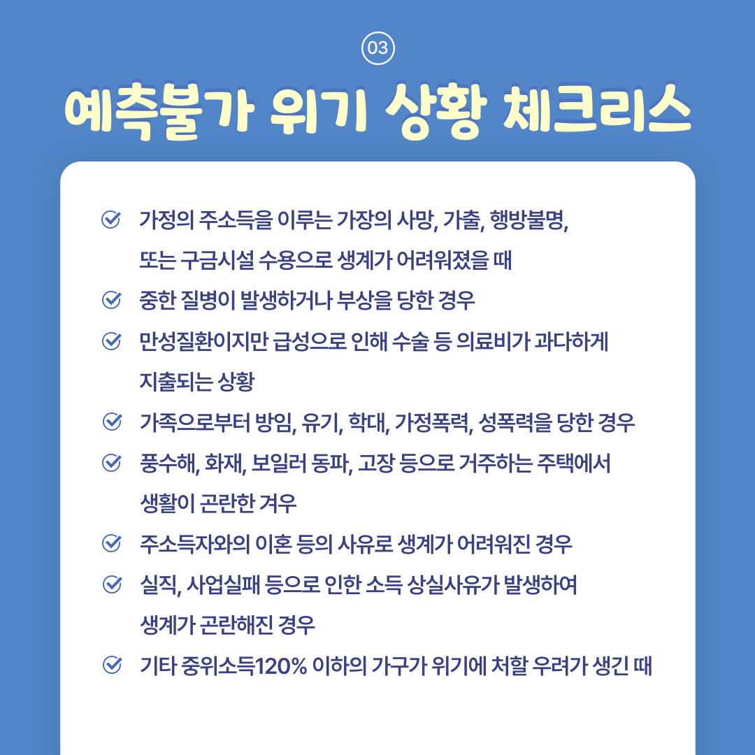 예기치 못한 사회적 위험으로 일상생활이 어려워진 가구들에게 단기적인 지원을 제공하여 위기 상황을 해소하는 것을 목표로 합니다.