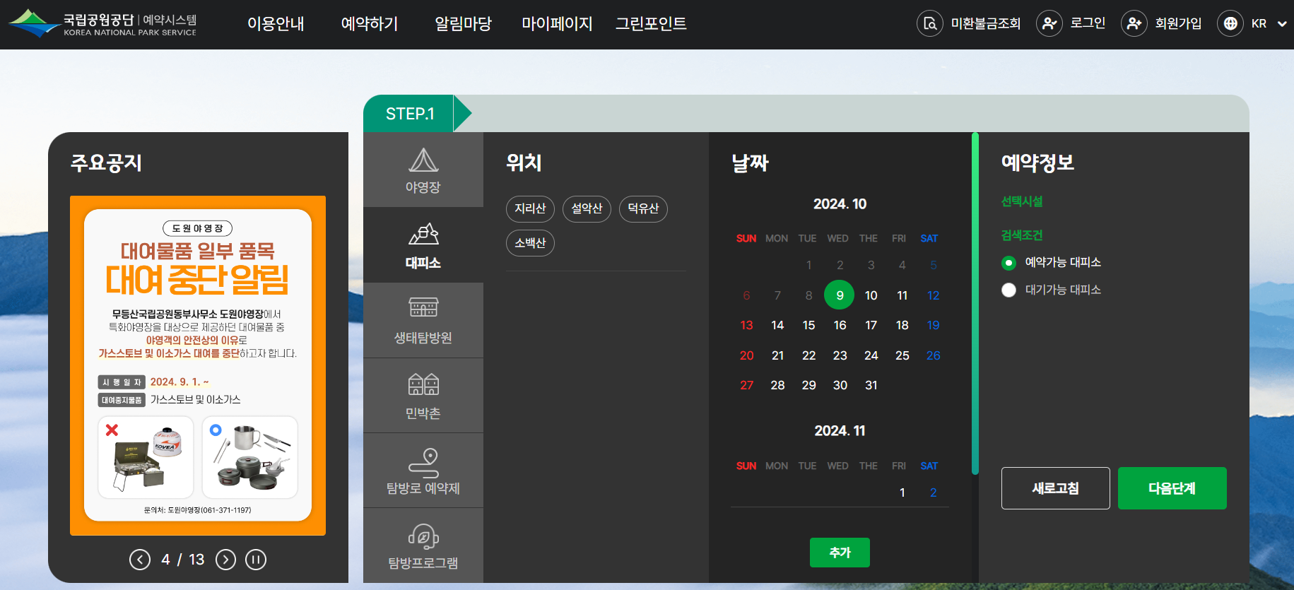 국립공원공단 예약시스템은 국립공원의 야영장과 대피소를 예약할 수 있는 공신력 있는 사이트입니다. 공단에서 관리하는 깨끗하고 안전한 시설을 이용할 수 있으며, 자연 보호 구역 내에서 캠핑을 즐길 수 있다는 점에서 많은 캠핑 애호가들에게 큰 인기를 얻고 있습니다. 특히 가야산, 계룡산 등 20여 개의 국립공원 캠핑장을 실시간으로 예약할 수 있어 자연을 사랑하는 사람들에게 최적의 선택이 됩니다.