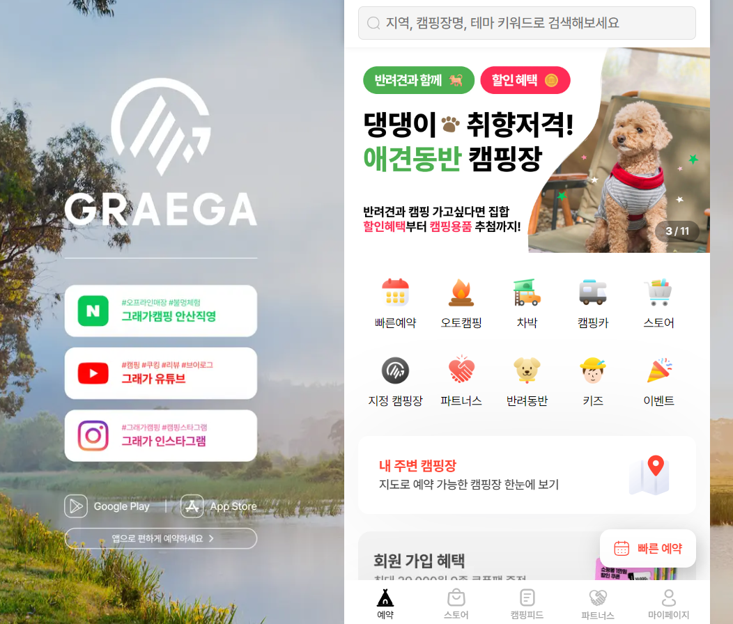 그래가캠핑은 사용자들이 지도 기반으로 캠핑장을 검색할 수 있도록 도와주는 플랫폼으로, 원하는 지역의 캠핑장을 빠르게 찾을 수 있는 것이 강점입니다. 또한 다양한 테마별로 인기 있는 캠핑장을 추천해주기 때문에, 원하는 스타일에 맞춰 캠핑을 계획할 수 있습니다.