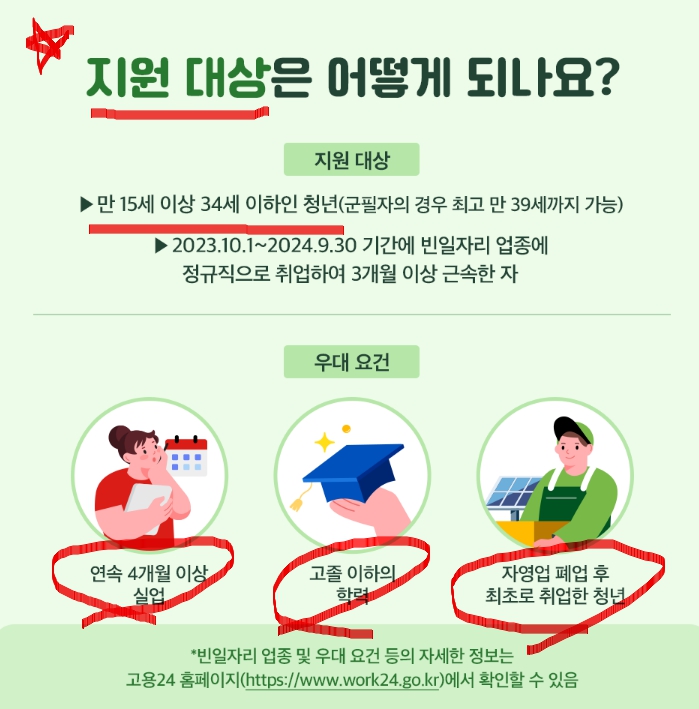 1) 2023.10.1.~2024.9.30. 기간 중에 빈일자리 업종에 취업한 청년으로, 근속기간이 3개월이상인 사람이면 신청할 수 있습니다.
