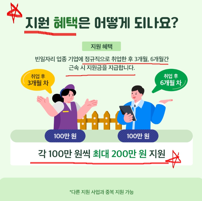 (취업 후 3개월 근속 시, 100만원 지원금 지급 + 취업 후 6개월 근속 시, 추가 100만원 지원금 지급)