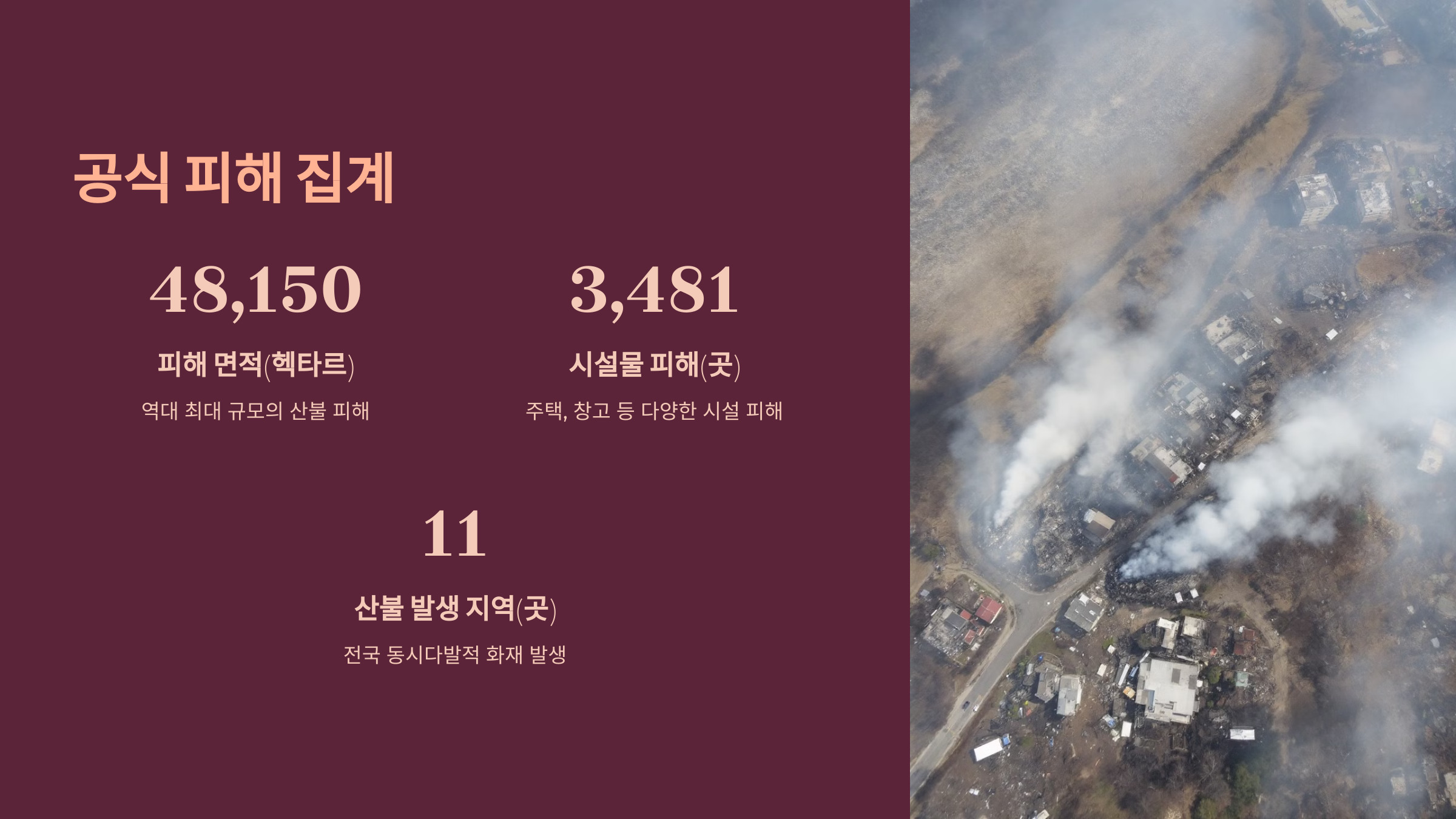 중앙재난안전대책본부(중대본)는 3월 28일 오전 9시 기준, 최근 전국 11곳에서 발생한 산불로 인해 피해 면적은 총 48,150헥타르에 달한다고 밝혔어요. 이는 현재까지 집계된 수치 중 가장 큰 산불 피해로 기록되고 있어요.
