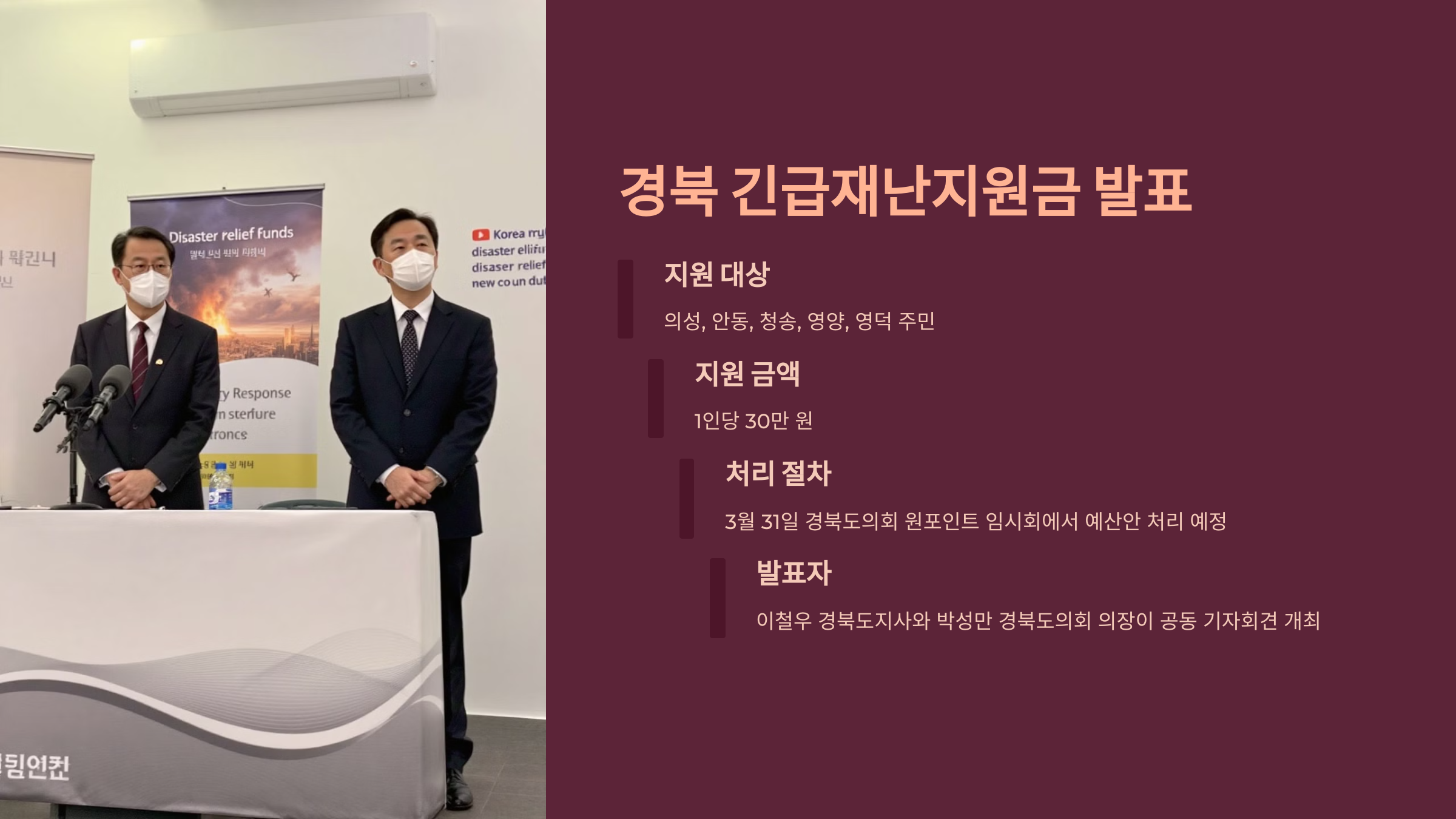 이철우 경북도지사와 박성만 경북도의회 의장은 이날 공동 기자회견을 열고 이를 발표했고, 3월 31일 경북도의회 원포인트 임시회를 열어 관련 예산안을 처리할 예정이라고 밝혔습니다.