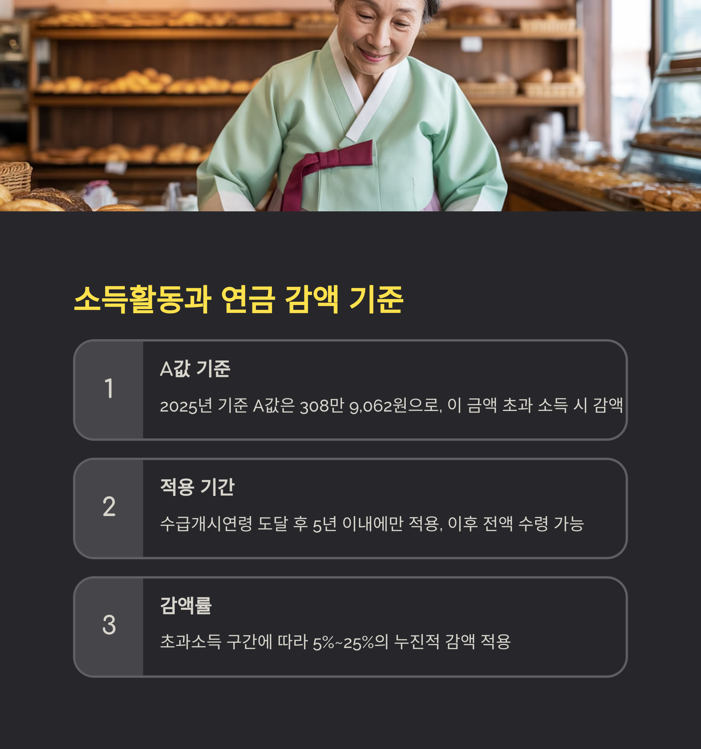 A4. 수급개시연령 후 5년 이내에 A값을 초과하는 소득이 있으면 구간별로 감액되어요. 2025년 기준 A값은 308만 9,062원이고, 초과소득에 따라 5%~25%의 감액이 적용되어요. 5년이 지나면 소득에 관계없이 연금을 전액 받을 수 있어요.