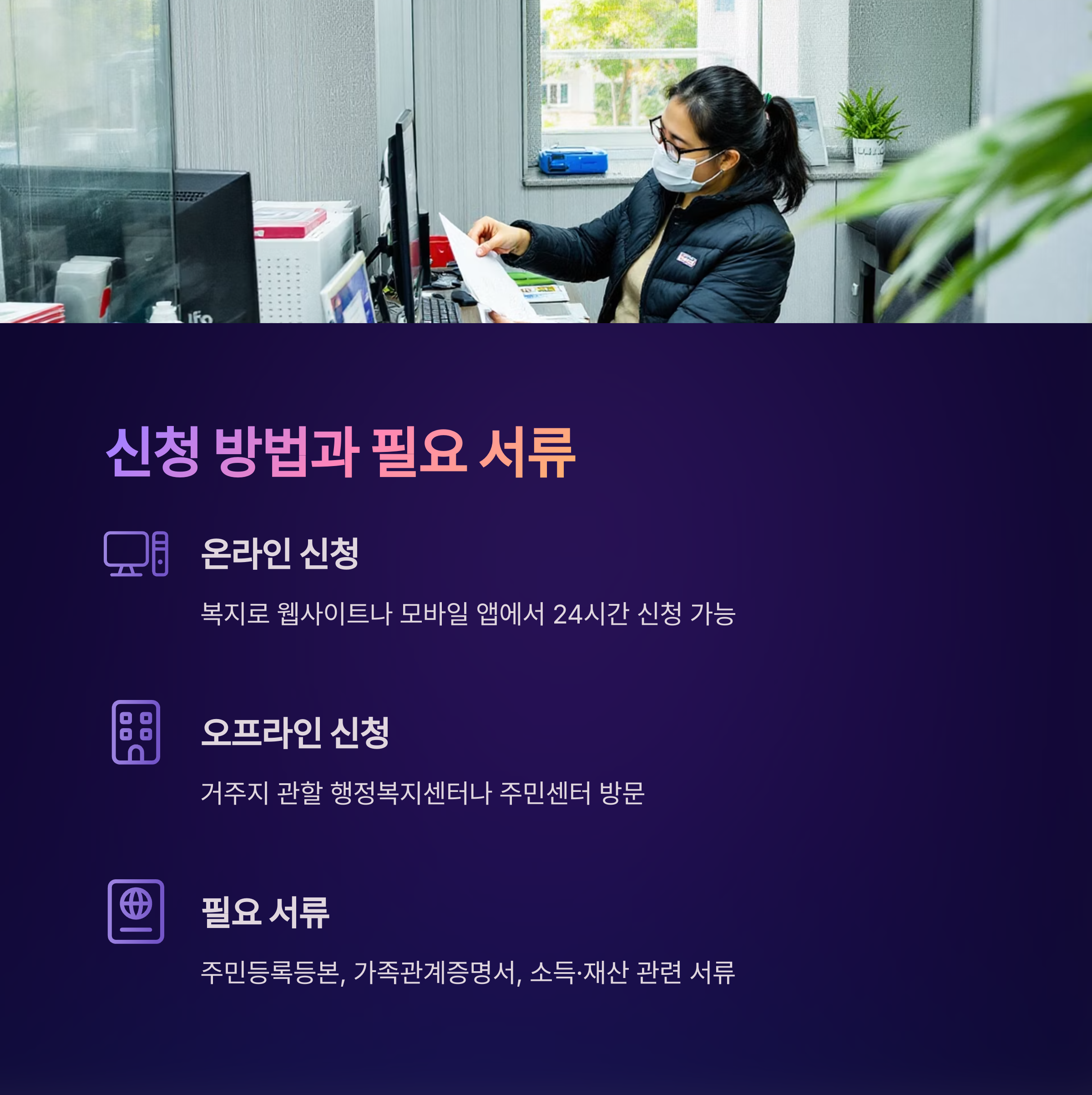기초생활수급자 신청은 온라인과 오프라인 두 가지 방법으로 가능해요. 온라인 신청은 복지로 웹사이트나 모바일 앱을 통해 24시간 언제든지 할 수 있고, 오프라인 신청은 거주지 관할 행정복지센터나 주민센터를 방문하면 돼요. 온라인 신청이 편리하지만, 복잡한 서류나 상담이 필요한 경우에는 직접 방문하는 것이 좋답니다.