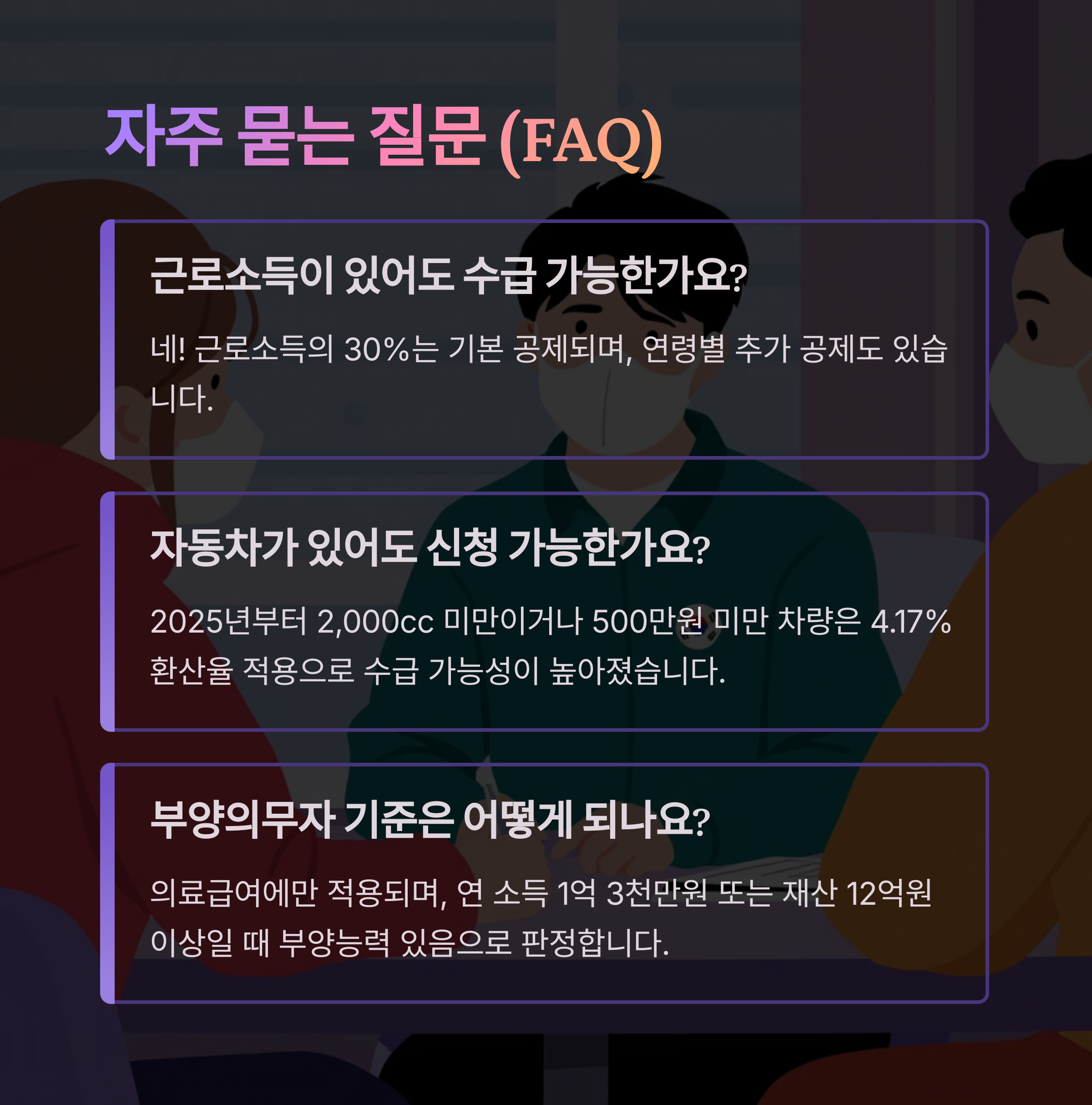 A2. 2025년부터 자동차 기준이 대폭 완화되어 2,000cc 미만이면서 500만 원 미만의 차량은 일반재산 환산율 4.17%만 적용받아요. 또한 2,000cc 미만이면서 10년 이상 된 차량은 가격에 상관없이 4.17% 환산율을 적용받을 수 있어 자동차 보유자도 수급 가능성이 크게 높아졌답니다.