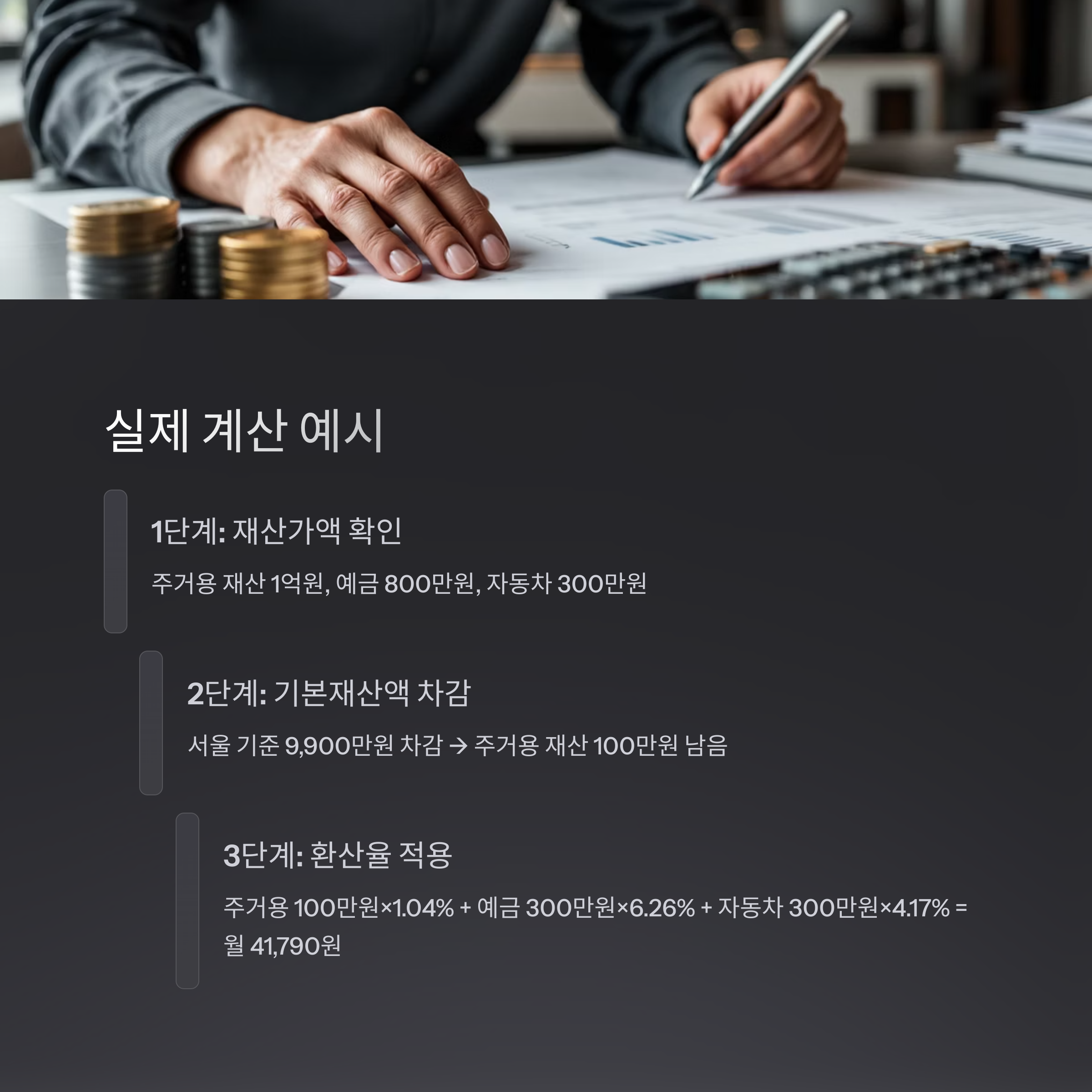 주거용 재산에는 지역별 한도액이 설정되어 있어요. 서울 1억 7,200만 원, 경기도 1억 5,100만 원, 광역시·세종·창원 1억 4,600만 원, 그 외 지역 1억 1,200만 원까지는 주거용 재산 환산율 1.04%를 적용받아요. 한도액을 초과하는 부분은 일반재산으로 간주되어 4.17%의 높은 환산율을 적용받게 되죠.