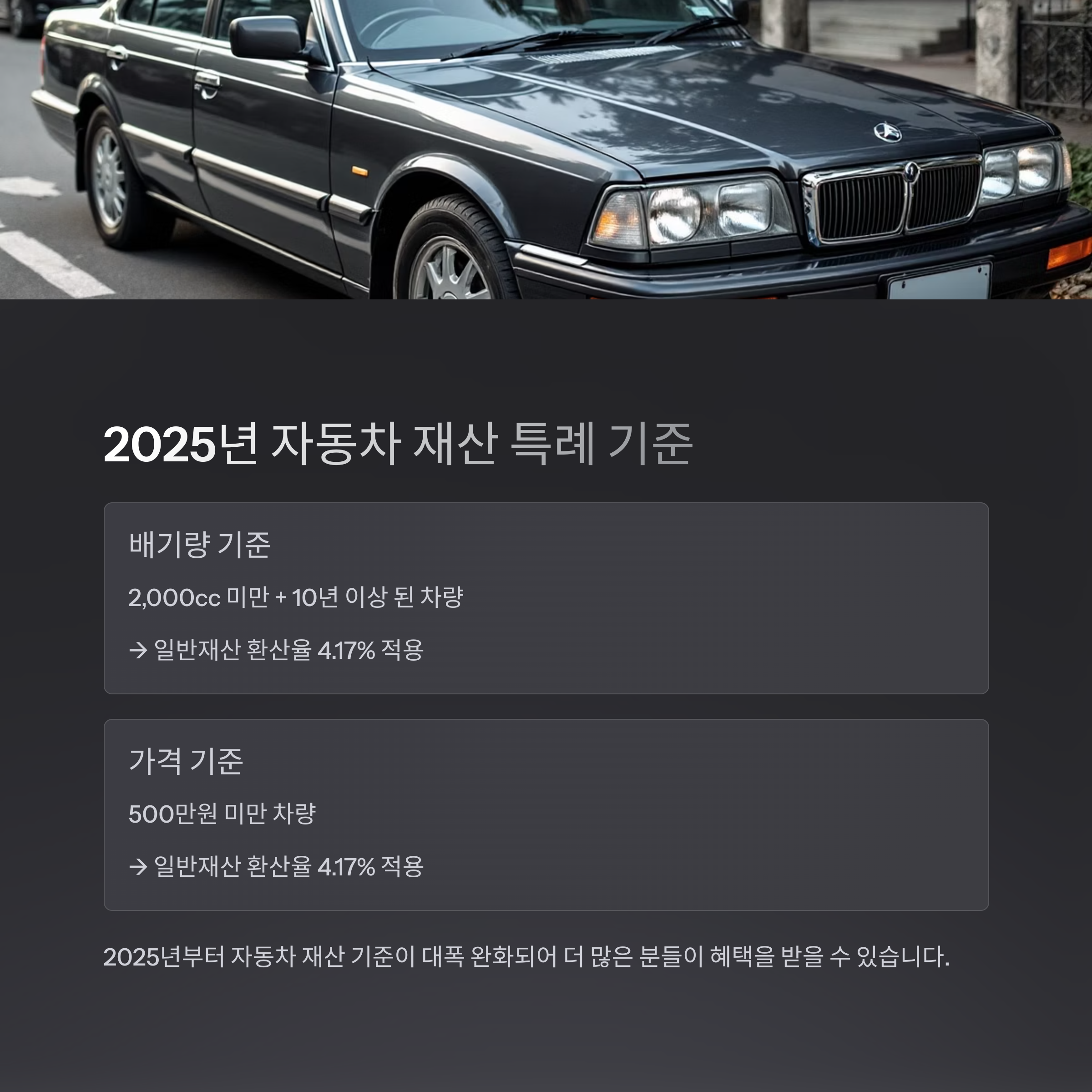 2025년부터 자동차 재산 기준이 대폭 완화되었어요! 기존에는 1,600cc 미만이고 10년 이상 된 차량 또는 200만 원 미만의 차량만 특례를 받을 수 있었는데, 2025년부터는 2,000cc 미만이고 10년 이상 된 차량 또는 500만 원 미만의 차량으로 기준이 완화되었어요. 이 기준에 해당하는 자동차는 100% 소득환산이 아닌 일반재산 환산율 4.17%를 적용받아요.