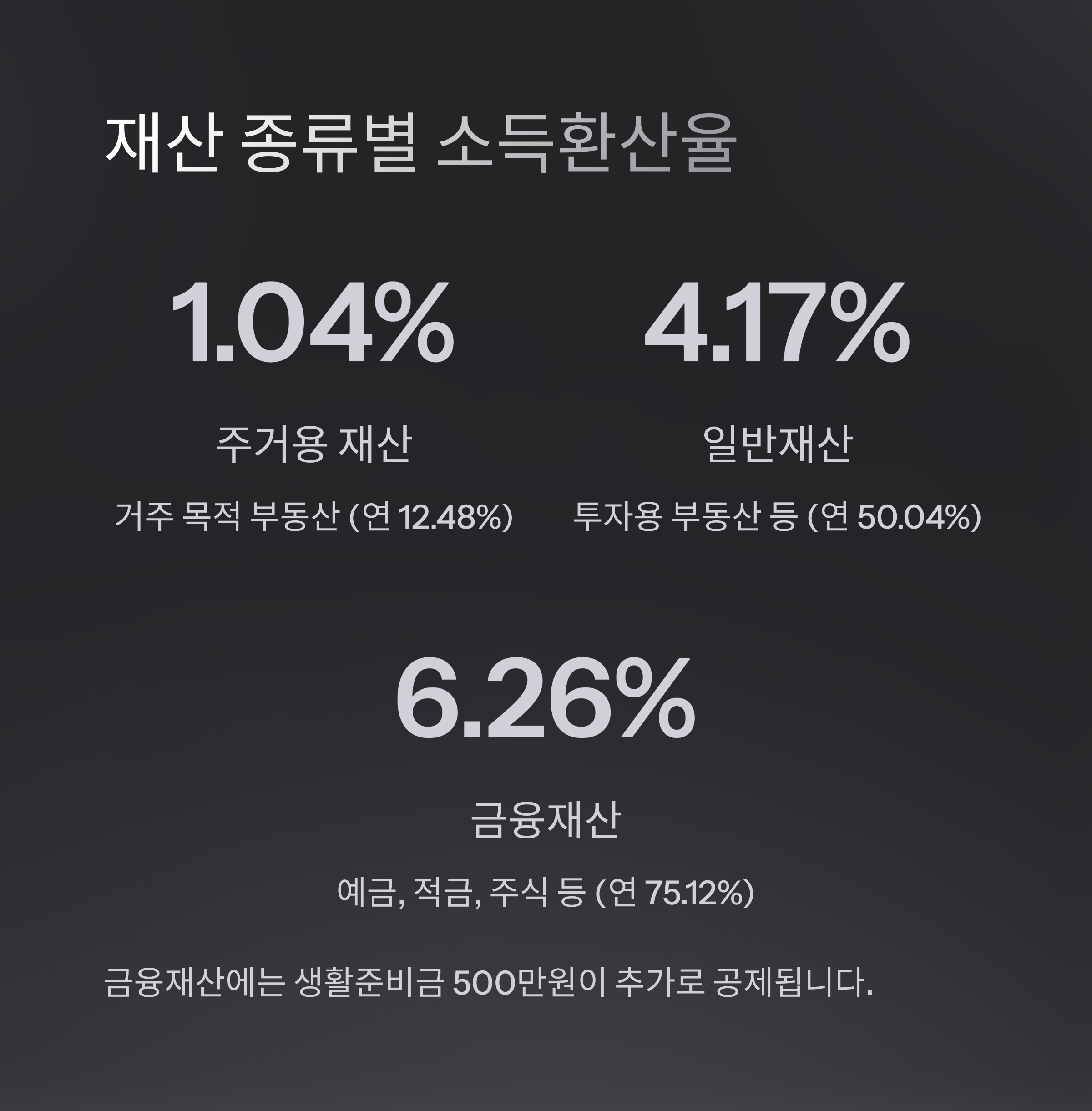 2025년 기준 재산 종류별 소득환산율은 재산의 성격과 유동성을 고려해서 차등 적용돼요. 주거용 재산은 월 1.04%(연 12.48%)로 가장 낮고, 일반재산은 월 4.17%(연 50.04%), 금융재산은 월 6.26%(연 75.12%)로 가장 높아요. 자동차 재산은 원칙적으로 100% 소득환산되지만, 특례 기준에 해당하면 일반재산 환산율을 적용받아요.