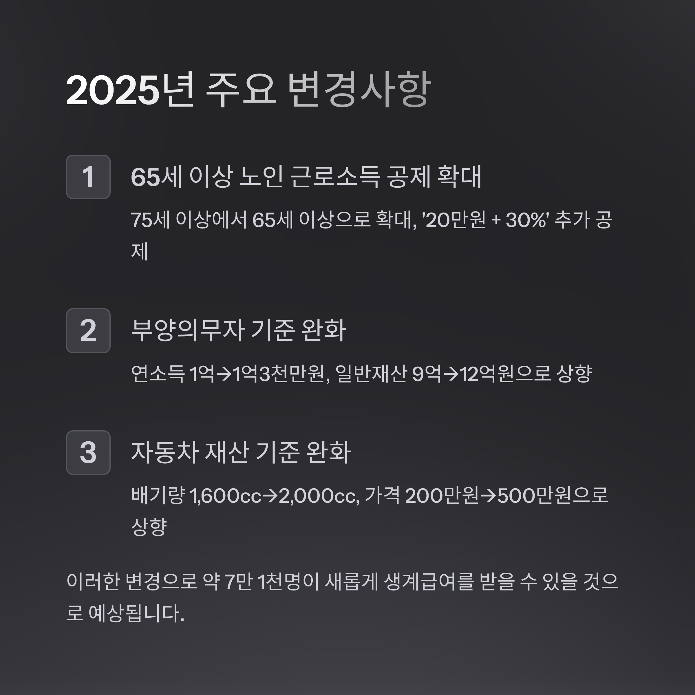 2025년에는 기초생활수급자 선정 기준이 대폭 개선되었어요! 가장 큰 변화는 65세 이상 노인 근로소득 공제 확대예요. 기존에는 75세 이상 노인에게만 '20만 원 + 30%' 추가 공제를 적용했는데, 2025년부터는 65세 이상 노인으로 확대되었어요. 68세 노인이 월 100만 원 근로소득을 얻는 경우, 기존에는 70만 원이 소득으로 인정되었지만 2025년에는 56만 원만 인정되어 14만 원이나 줄어들었어요.