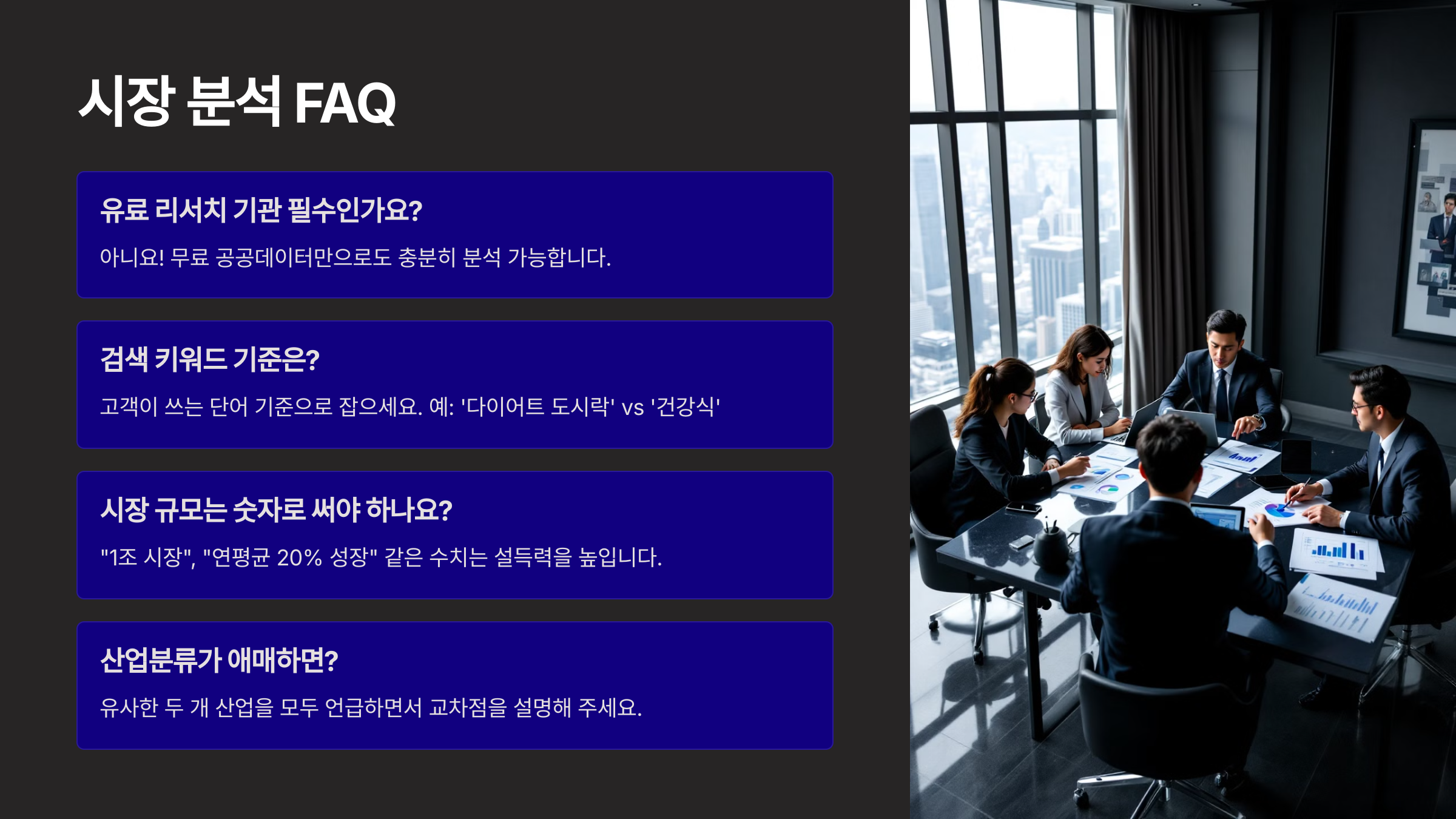 A3. 네! “1조 시장”, “연평균 20% 성장” 같은 수치는 꼭 넣어야 설득력이 생겨요.