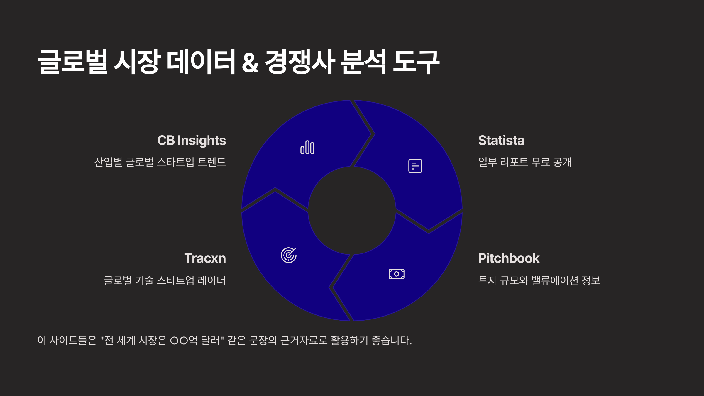 이 사이트들은 발표 시 “전 세계 시장은 ○○억 달러” 이런 문장 쓸 때 근거자료 링크로 넣기 딱 좋아요!