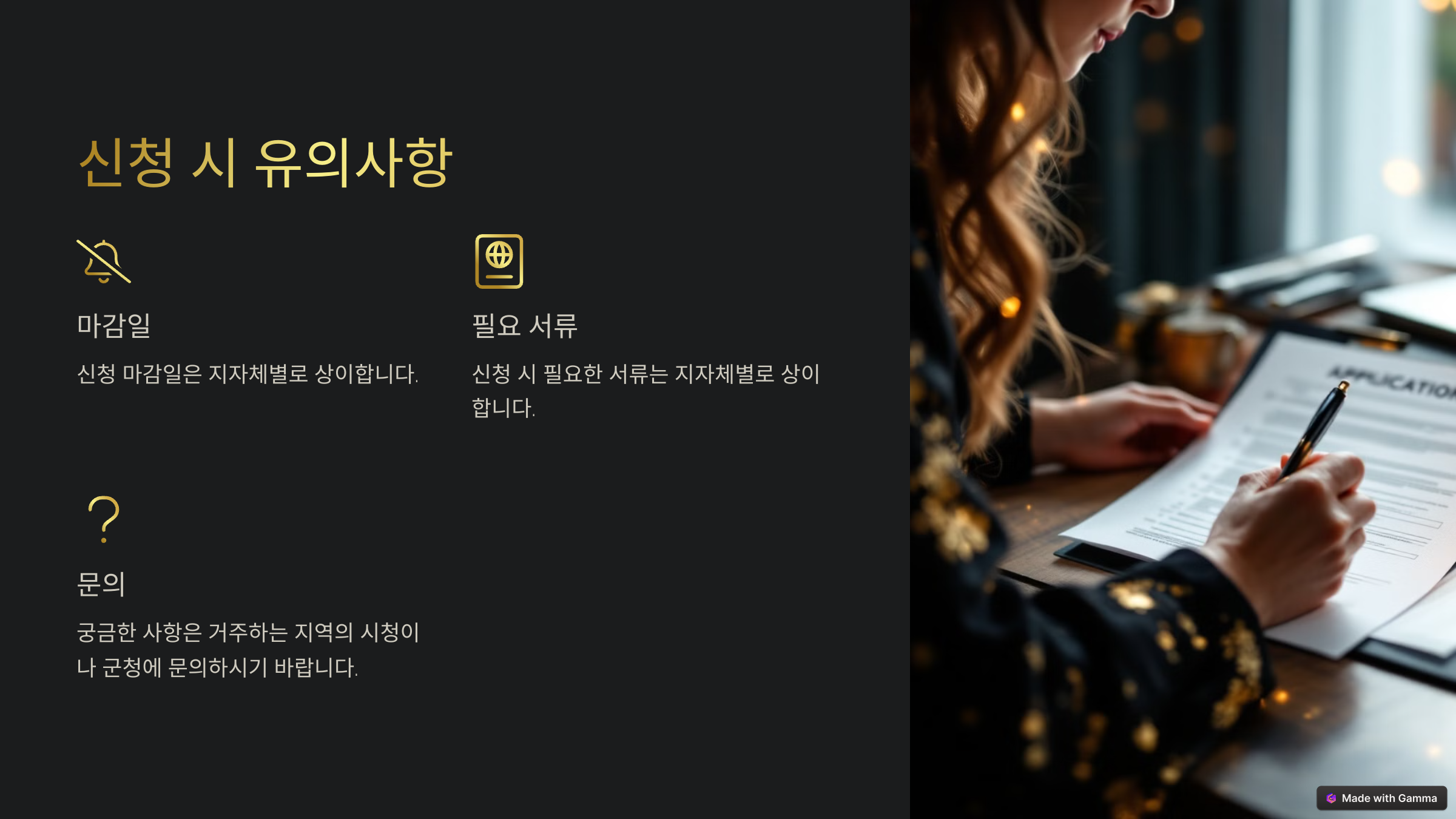 - 일부 지원금은 중복 수혜가 불가능할 수 있습니다. 예를 들어 정부 지원금과 지자체 지원금을 동시에 받을 수 없는 경우가 있으므로, 신청 전에 반드시 확인해야 합니다.