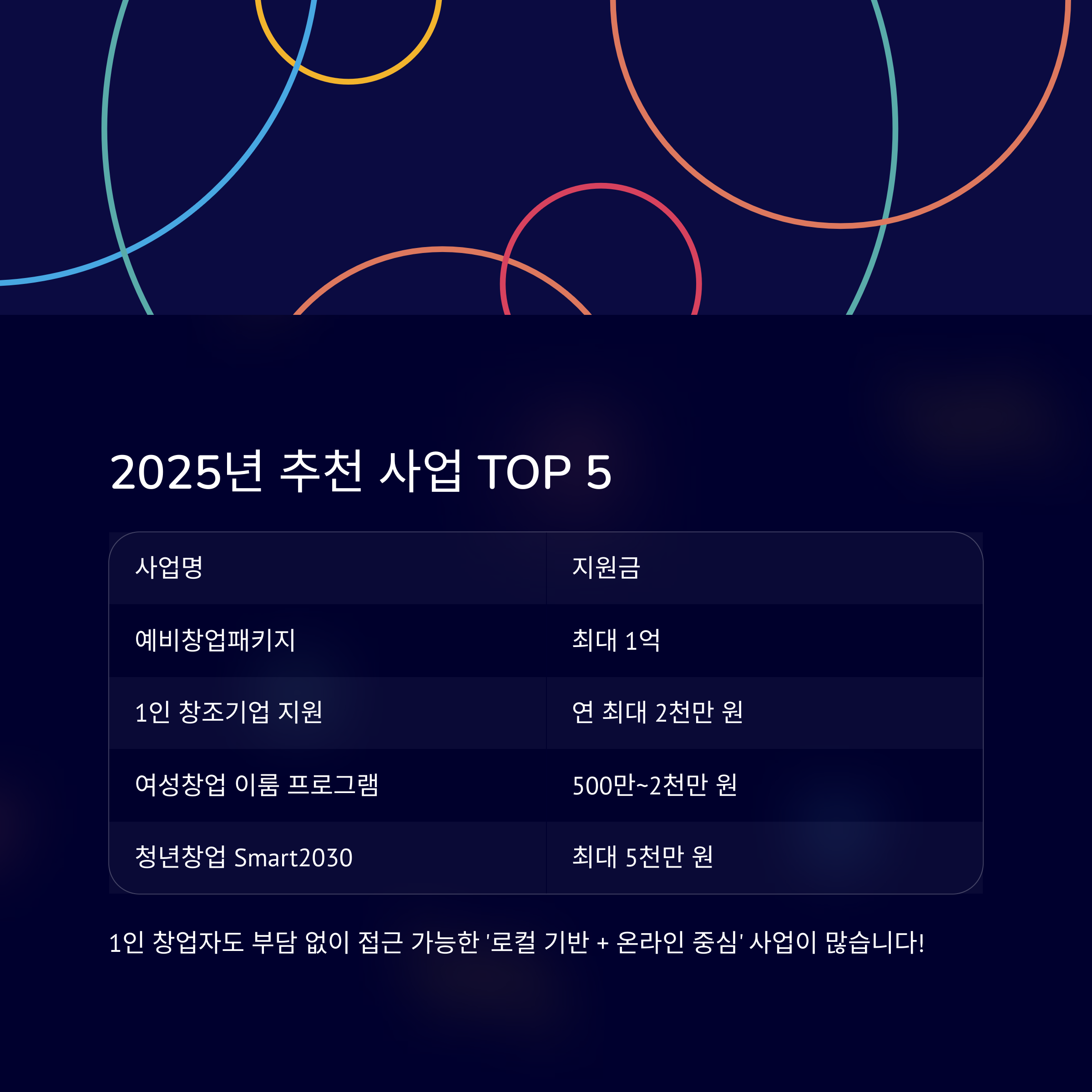 | 1인 창조기업 지원 | 연 최대 2천만 원 | 디지털 콘텐츠, 교육, 디자인, 커머스 등 |