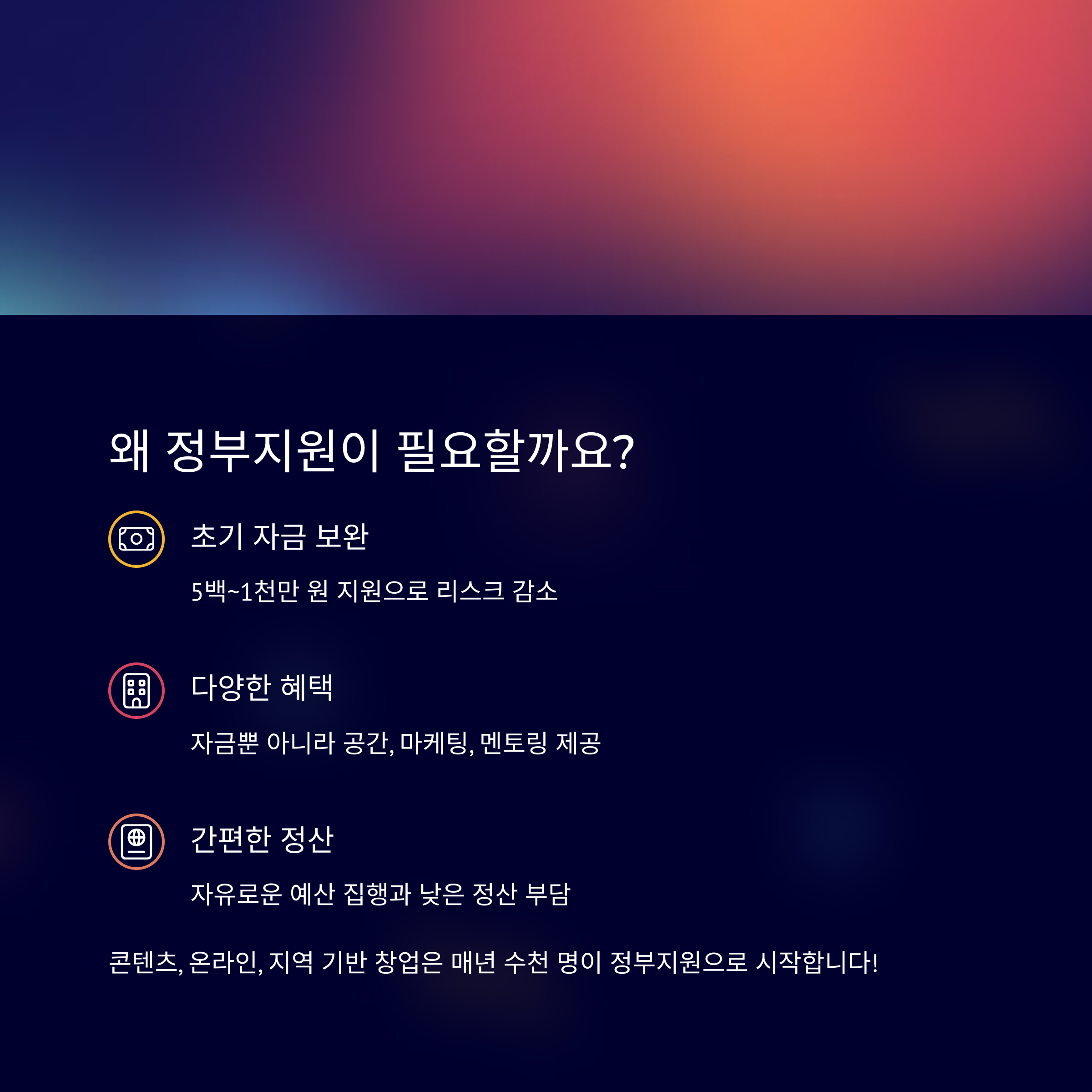 📌 특히 콘텐츠, 온라인, 지역 기반 창업은 매년 수천 명이 정부지원을 통해 시작하고 있어요!