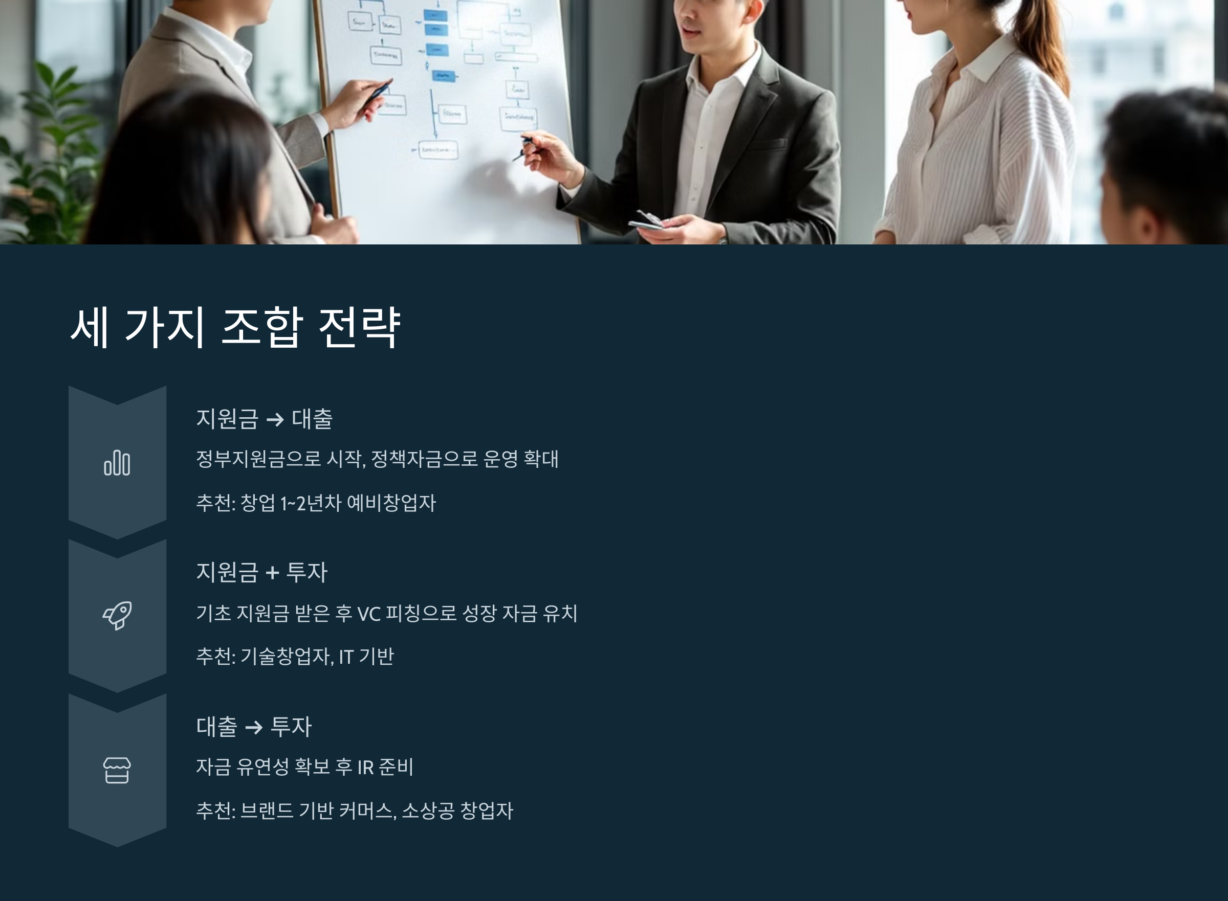 2025년 기준으로 많은 청년창업자들은 자금을 하나만 쓰지 않아요. 지원금 + 대출 + 투자를 시기별로 조합해서 자금을 확보하는 방식이 트렌드예요. 가장 추천되는 조합 3가지 모델을 소개할게요!