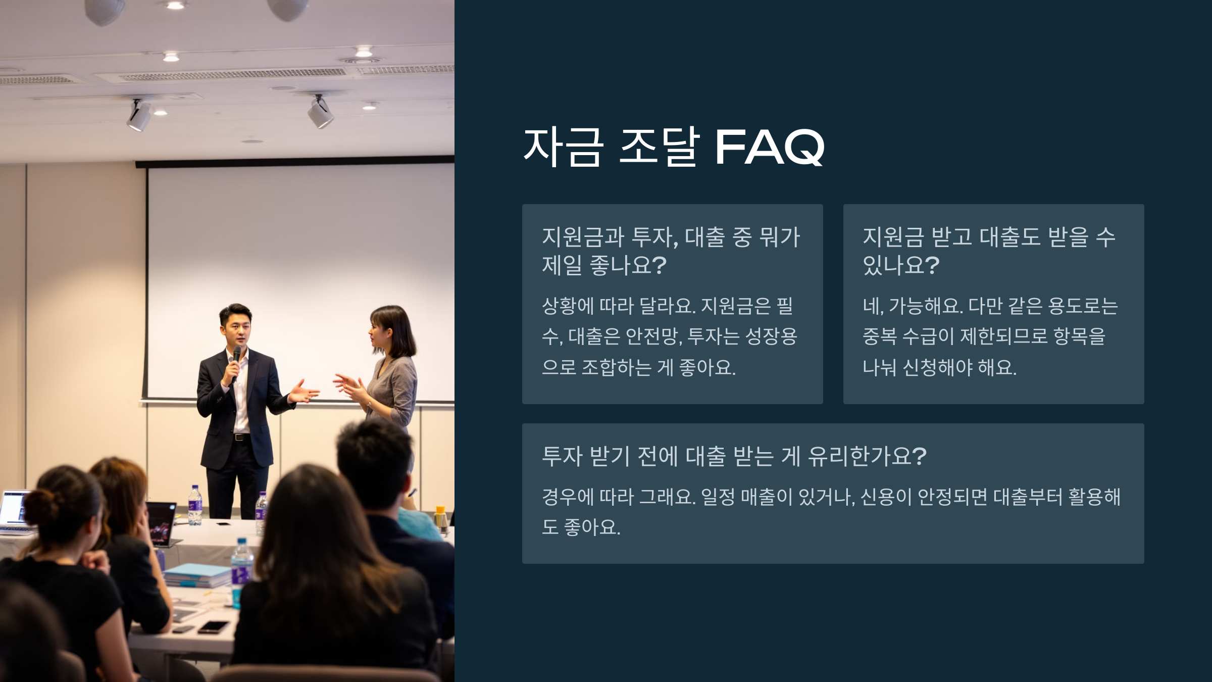 A1. 상황에 따라 달라요. 지원금은 필수, 대출은 안전망, 투자는 성장용으로 조합하는 게 좋아요.