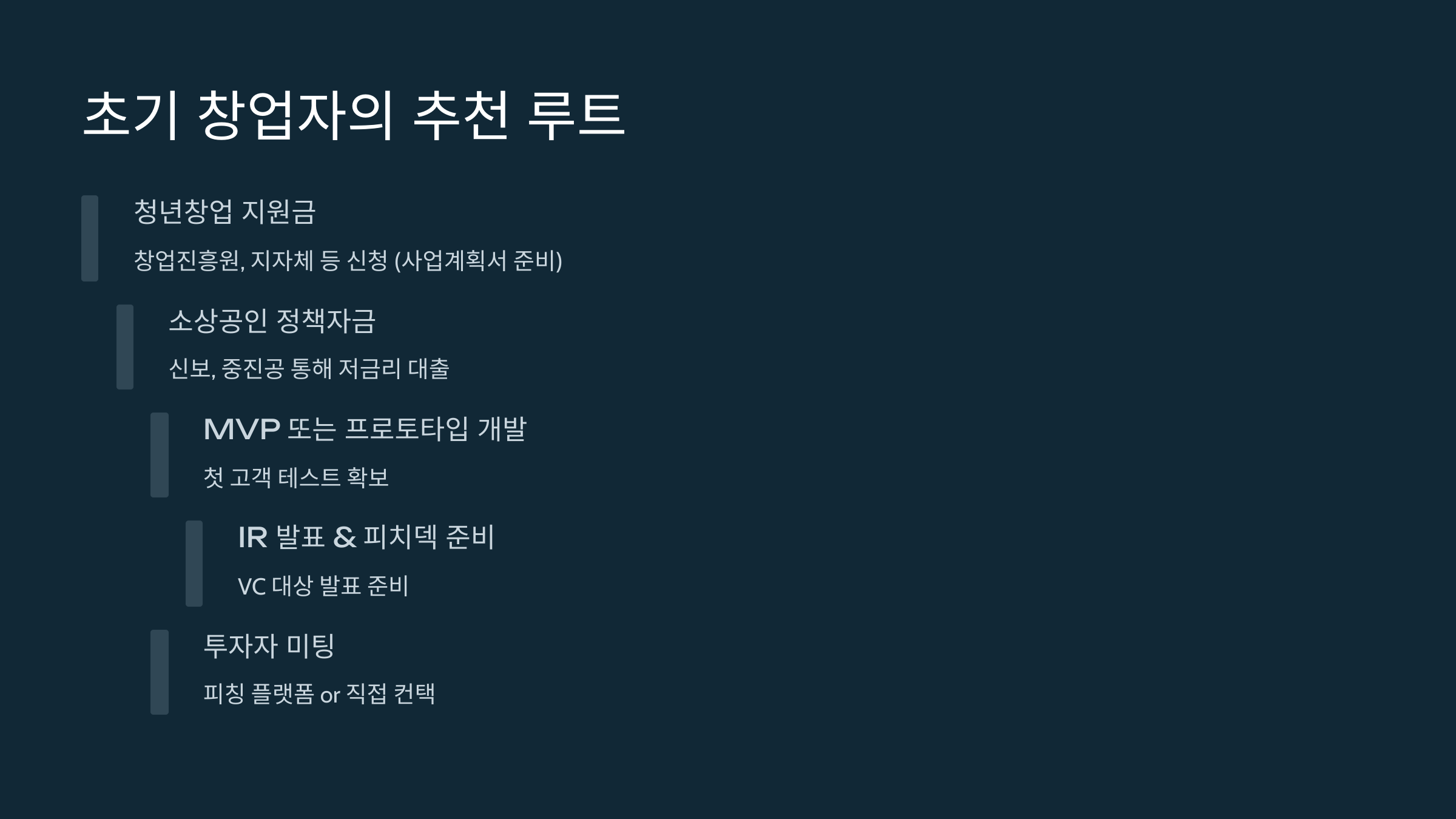 | 지원금 + 투자 | 기초 지원금 받은 후 VC 피칭으로 성장 자금 유치 | 기술창업자, IT 기반 |