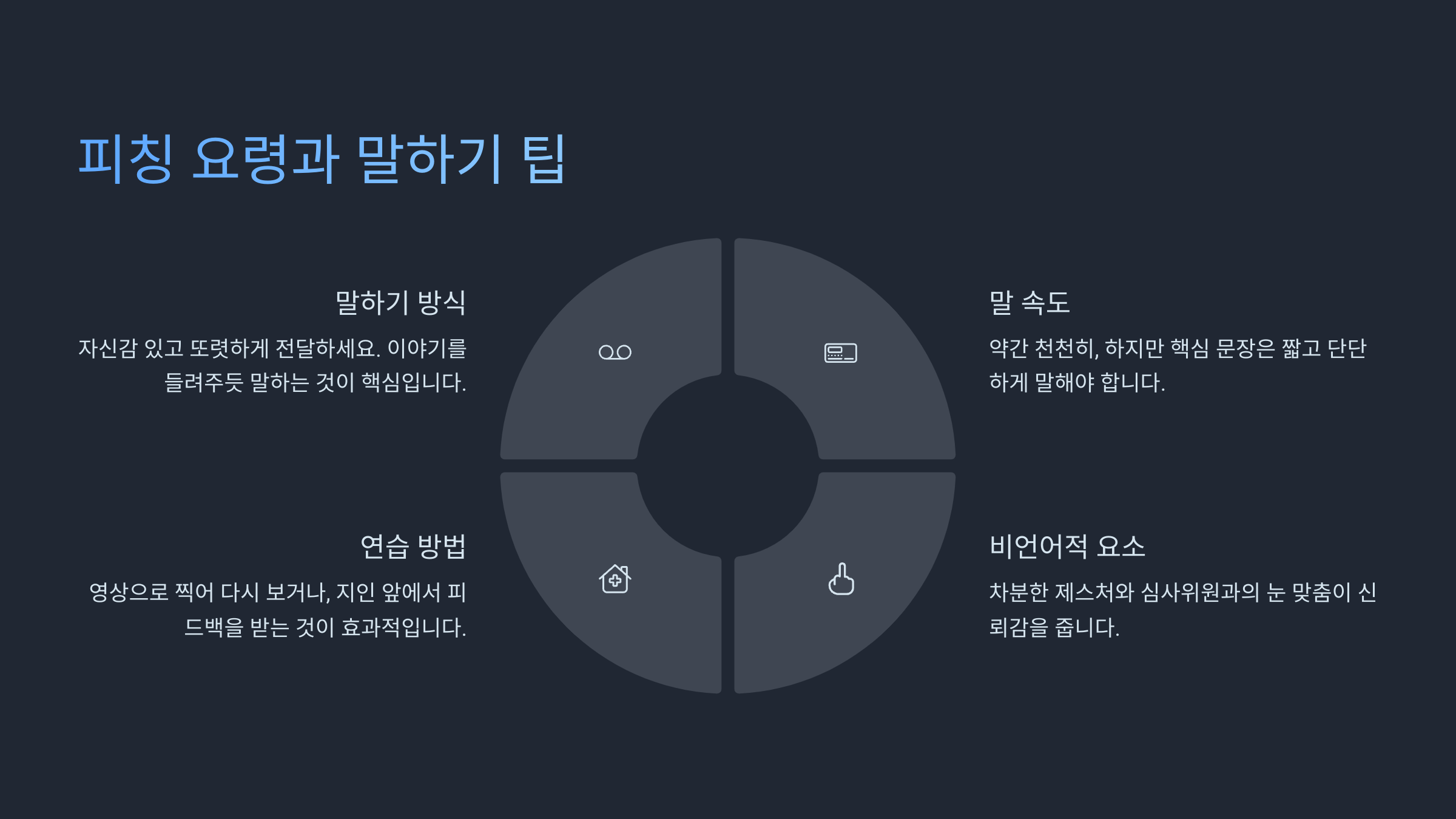 말 속도는 약간 천천히, 하지만 핵심 문장은 짧고 단단하게 말해야 해요. 예를 들어 “우리는 3개월 만에 1만 다운로드를 달성했습니다” 같은 숫자 기반 문장을 정확하게 던져주는 게 좋아요.