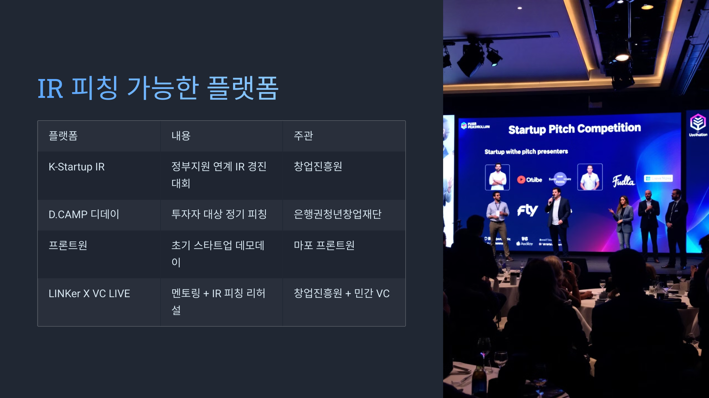 정부, 민간, 대학 등 다양한 플랫폼에서 IR 발표 기회를 제공해요. 실제 투자 유치로도 연결되니 꼭 도전해보세요!