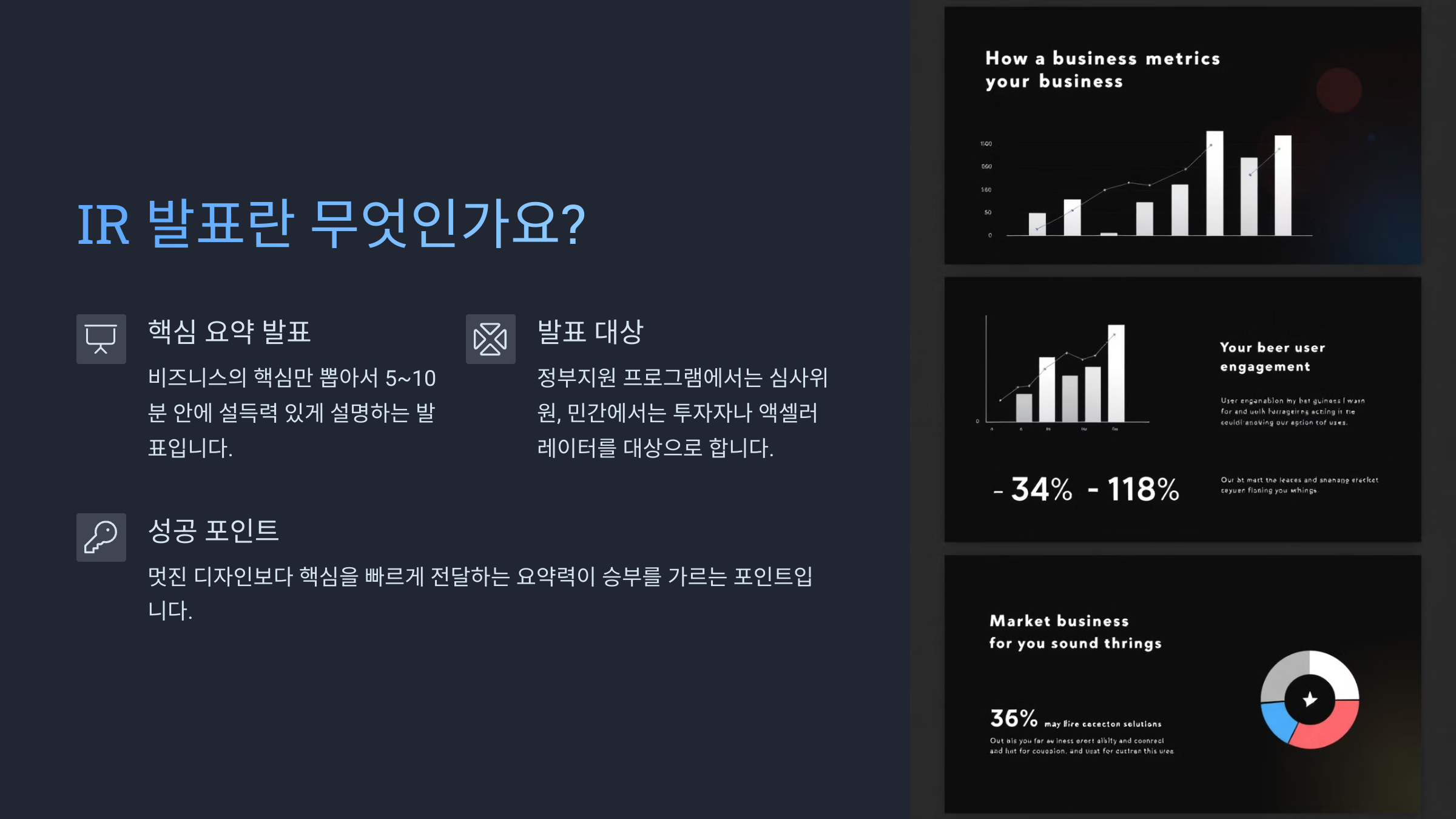 IR 발표에서 시선을 끌고 핵심을 정확히 전달하려면, 슬라이드 디자인이 정말 중요해요. 하지만 복잡하고 예쁜 디자인보다도, 간결하고 명확한 정보 전달이 훨씬 효과적이에요.