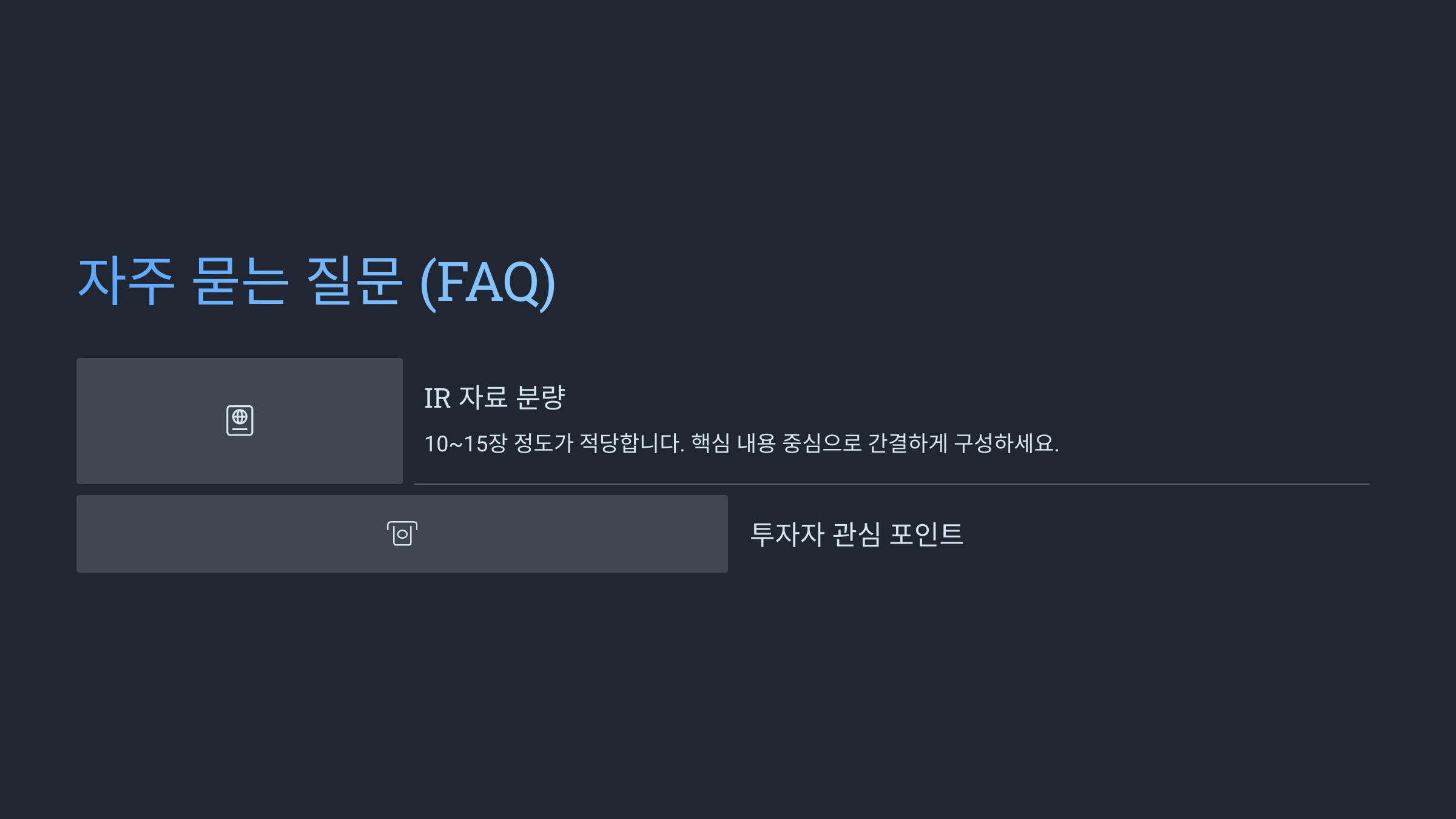 A8. 아니에요! 투자제안서는 서면 문서고, IR 발표자료는 시각 중심의 요약 콘텐츠예요. 목적과 구성 방식이 달라요.