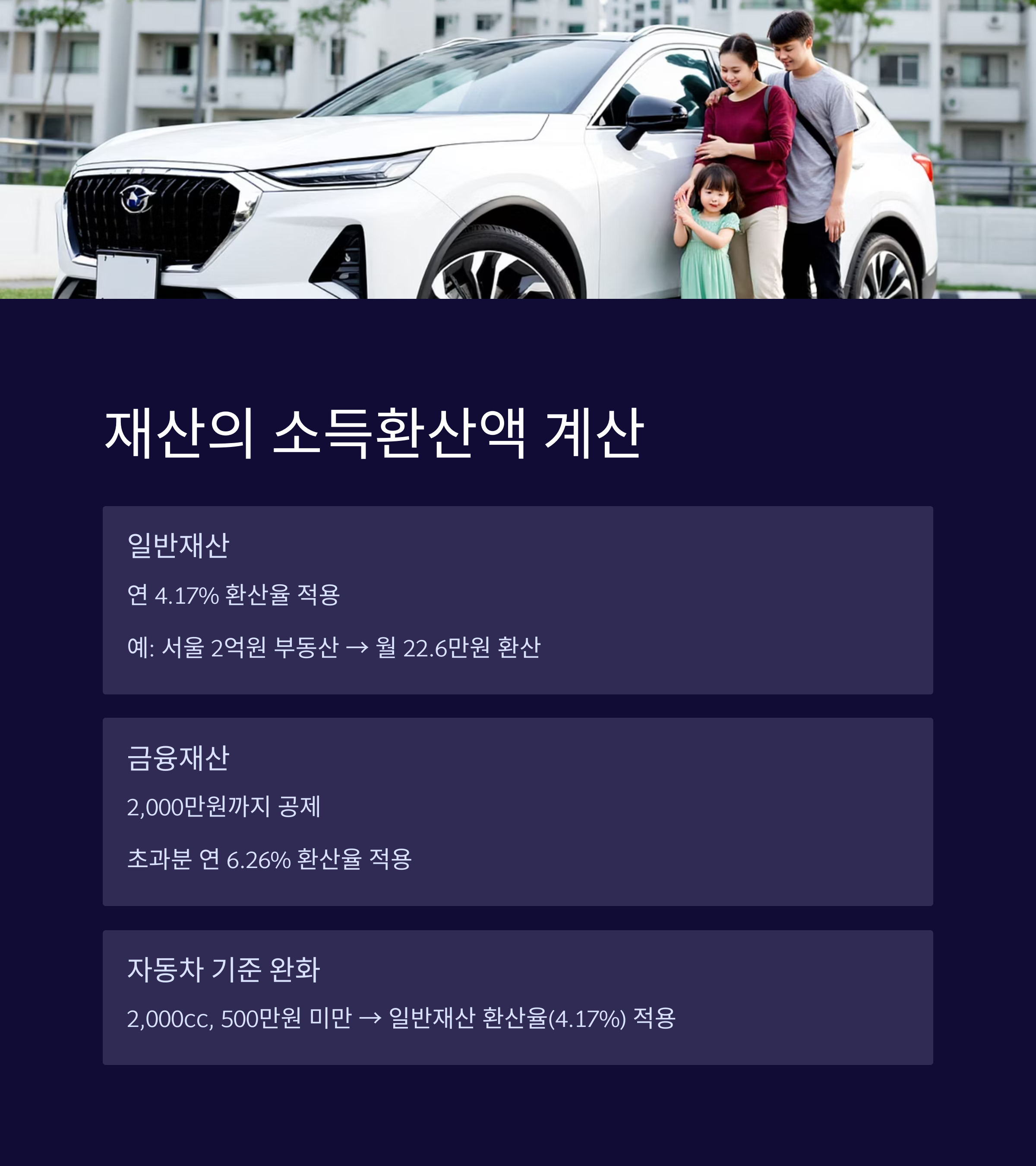 2025년의 가장 큰 변화는 자동차 재산 기준 완화예요. 기존에는 1,600cc, 200만원 미만의 차량만 일반재산으로 인정받았지만, 2025년부터는 2,000cc, 500만원 미만으로 확대되었어요. 이 기준에 해당하는 자동차는 일반재산 환산율 4.17%가 적용되어 차량가액의 일부만 소득으로 산정됩니다. 예를 들어 400만원짜리 1,800cc 차량을 소유하고 있다면, 기존에는 연 100% 환산율이 적용되어 월 33만 3천원이 소득으로 계산되었지만, 이제는 연 4.17% 환산율이 적용되어 월 약 1만 4천원만 소득으로 계산되어요.