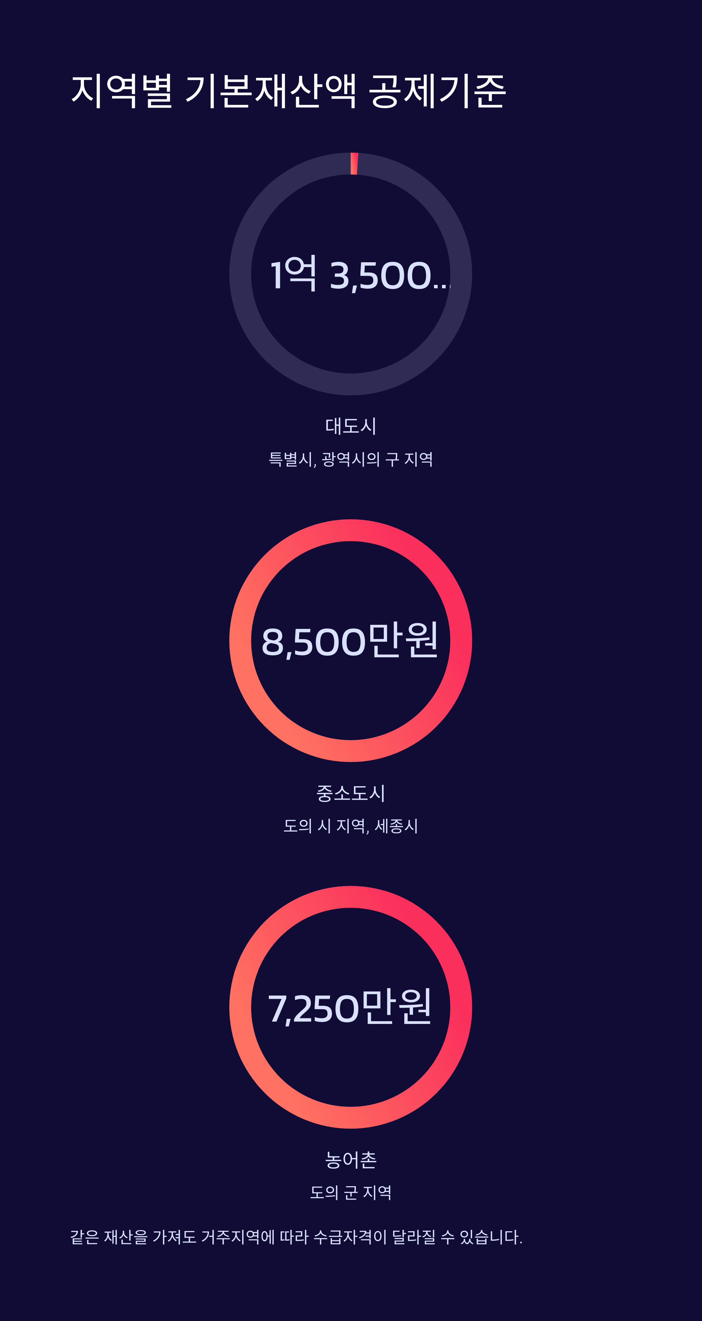 기초생활수급자 소득인정액 계산에서 지역별 기본재산액 공제기준은 매우 중요한 요소예요. 거주지역에 따라 기본재산액 공제기준이 달라지기 때문에 같은 재산을 가지고 있어도 거주지역에 따라 수급자격이 달라질 수 있어요. 대도시는 1억 3,500만원, 중소도시는 8,500만원, 농어촌은 7,250만원으로 설정되어 있답니다. 이는 지역별 생활비 차이와 부동산 가격 차이를 반영한 것이에요.
