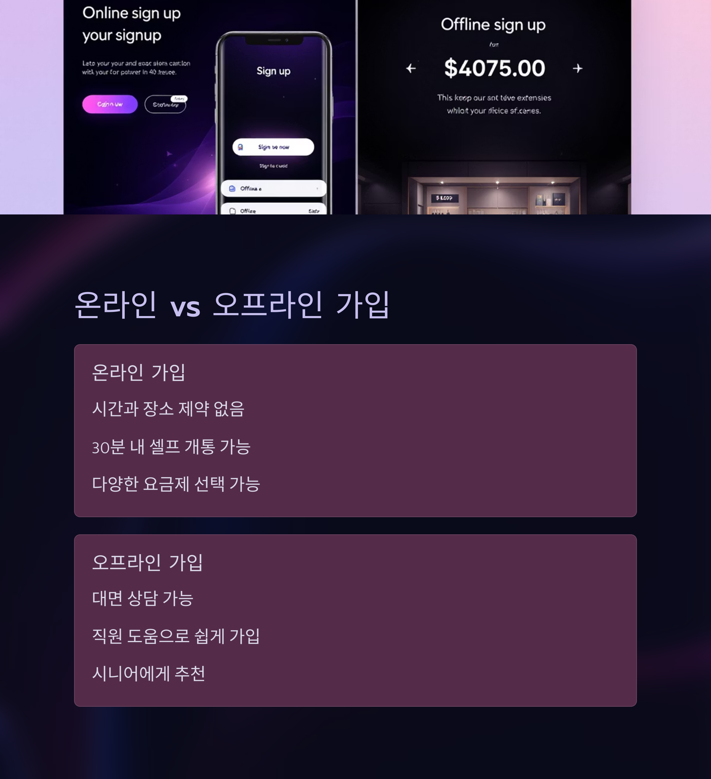 하지만 오프라인 매장은 운영 시간이 제한적이고, 요금제가 온라인보다 다양하지 않은 경우도 있으니 사전에 비교해보는 게 좋아요.