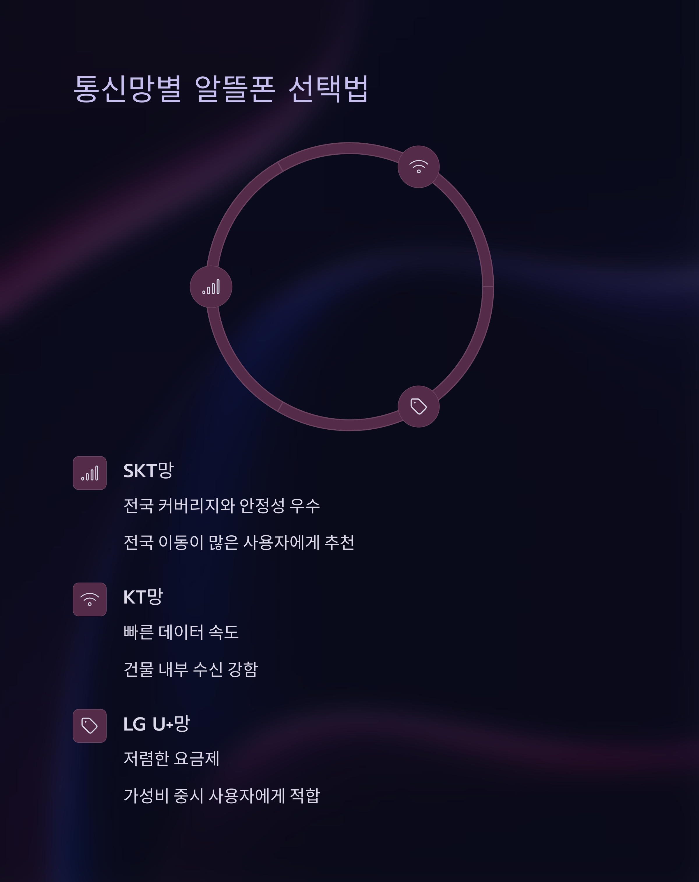 SKT망은 전국망 커버리지와 안정성이 뛰어나서 인기가 많고, KT망은 상대적으로 데이터 속도가 빠르며 지하나 건물 내부에서 강한 신호를 보이는 경우가 많아요. LG U+망은 요금제 혜택이 좋은 편이라 가격 대비 성능을 중요시하는 분들에게 추천돼요.